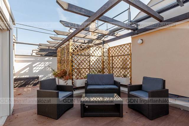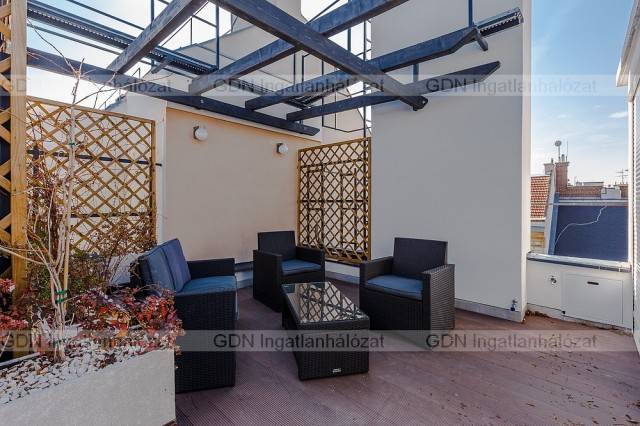 Kuriózumnak számító tetőteraszos lakás a világörökség részeként nyilvántartott Andrássy úton. Korhűen felújított századfordulós palotában ajánljuk figyelmébe ezt a tetőtér beépítés során kialakított új építésű, belvárosi ingatlant. Praktikus duplex kialakításának köszönhetően remekül szeparálódnak a funkciók, az alsó szinten a nappali mellett egy jelenleg nyitott de könnyes szeparálható ablakos konyha és egy ablakos fürdőszoba épített zuhannyal. Az emeleten található a két háló és a szintén ablakos, kádas fürdőszoba. A nappali utcafronti terasszal rendelkezik és DNY-i tájolású. A lakás közösségi tereiben padló fűtés a hálószobákban pedig radiátoros fűtés. A 23m2-es privát tetőterasz a lakás igazi különlegessége mely kiemeli az Andrássy úti ingatlanok között is. Itt a lehetőség az időtálló és értékálló befektetésre, most 15%-kal olcsóbban és ajándék konyhabútorral vásárolhat Budapest egyik legnagyobb presztízsű helyén. Minőségi kivitelezés, igényes megoldások és átgondolt alaprajz.
