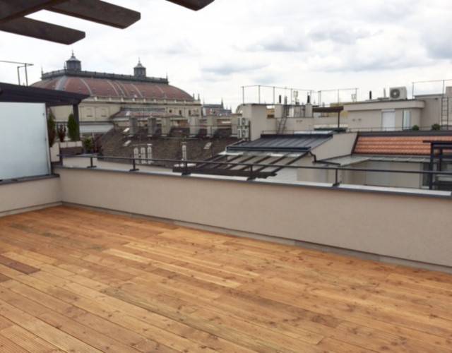 Fantasztikus lehetőség Szent István Bazilika és a Magyar Állami Operaház között az új Hilton szálló mellett. Egy felújított liftes épület tetőterében kialakított tetőteraszos lakást vásárolhat! A két hálószobás lakás nappalija erkélyes, az igazi különlegessége a lakáshoz tartozó privát 61m2-es teetőterasz melyről pazar kilátás nyílik a városra. A konyha a nappalitól elkülönülve egy ablakos helyiségben került kialakításra mely igény szerint akár teljesen lezárható , a nappalitól szeparálható, az utcai hálószoba közvetlen fürdőszoba kapcsolattal rendelkezik. Az egyedi fűtésnek köszönhetően kedvezően alakul a rezsi, az elhelyezkedésnek köszönhetően akár gyorsan és könnyedén bérbe adható. Az épület a tetőtér beépítéssel párhuzamosan teljesen megújult, A-tól Z-ig megújult és új panoráma lift került beépítésre.Amennyiben befektetési céllal vásárolná meg az ingatlant levesszük a válláról a terhet és akár teljes körű üzemeltetést is vállaljuk.