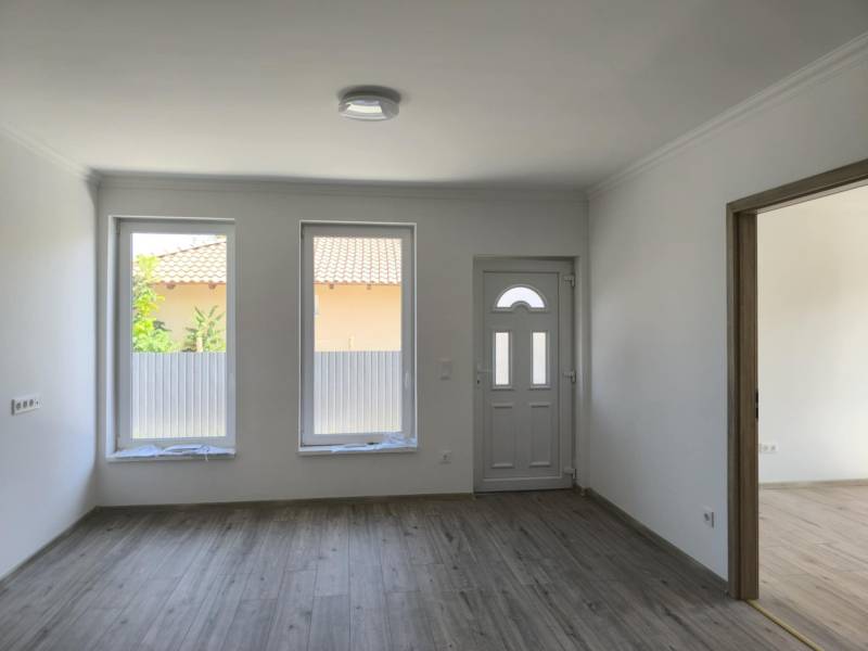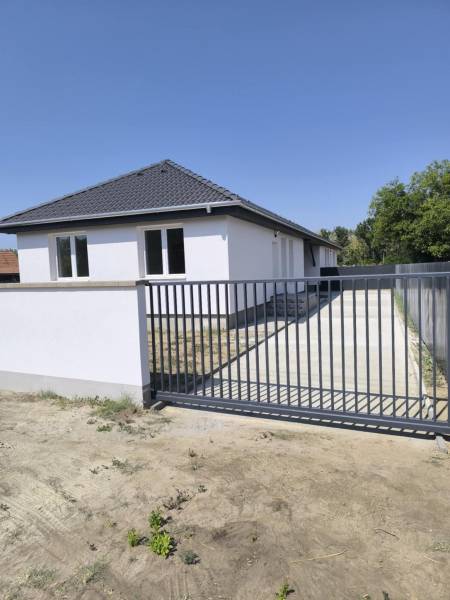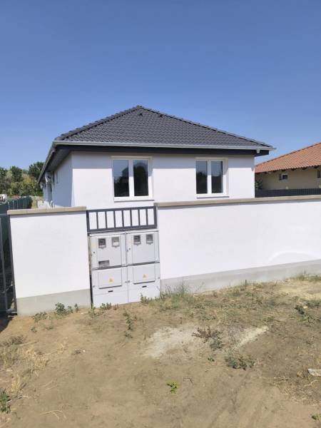 Foglalható sorház jellegű ikerházfél – referencia munkákkal! CSAK 3 darab készül!!! Dánszentmiklóson Budapesttől 50 kilométerre értékesitésre kinálók egy 70.62 nm sorház jellegű ikerház eladó autóbeállóval 300 nm külön bejáratú telekrésszel. Az épületeket fedett gépkocsibeálló köti össze, nincs közös fal. Elosztása előtér, 2 hálószoba, háztartási helyiség, fürdőszoba, külön WC, konyha, nappali kertkapcsolatos terasszal, rendezett udvar, előkerttel, kerítés az árban. Érintőleges műszaki leirás: Monolit beton sávalapozás készül. Az épület teherhordó és hőszigetelő főfalai 30 cm vastagságban PTH 30 NF kézi falazóblokkból, falazó habarcsba falazva készülnek. Az épületre állószékes fa fedélszerkezet kerül a vb koszorúhoz rögzítve. A szarufákra barna betoncserép fedés kerül. Az épületre állószékes fa fedélszerkezet kerül a vb koszorúhoz rögzítve. A szarufákra barna betoncserép fedés kerül. Fedett gépjárműtároló: 15x15 faoszlopokon, 10x15 cm fagerendázatú pergola. Homlokzaton megjelenő színek:Falazat: törtfehér nemes vakolat lábazat: sötétbarna műgyanta Homlokzaton megjelenő színek:Falazat: törtfehér nemes vakolat.Fehér színű műanyag nyílászárók, három rétegű hőszigetelő Low-E fóliás üvegezéssel. Belső padlóburkolat égetett kerámia, greslap illetve laminált parketta. Az ingatlan fűtése Hőszivattyús fűtés padlón keresztül történő hőleadással. Az ár tartalmaz egy darab 3,5 kw teljesítményű Hűtő-Fűtő klímát. Hideg meleg burkolatok 5500 Ft / nm árig választhatóak. Várható átadás 2026 májusában.Számos referencia munka megtekinthető a településen, így az érdeklődők személyesen is meggyőződhetnek a kivitelezés minőségéről. A fotók a településen kivitelezett munkákat szemléltetik. Dánszentmiklós közúton az M4-es és az M5 autópályákról könnyedén megközelíthető Budapest fővárostól 60 kilométerre helyezkedik el 30 perc alatt elérhető, a telek 405 főúttól 4 kilométerre található. Hivjon bizalommal, hétvégén is állok ügyfeleink rendelkezésére! Alitisz Judit 0620400-4009.