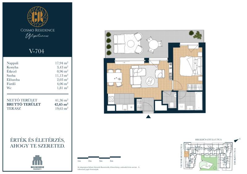 Projekt bemutatásaBudapest egyik legvonzóbb és legkeresettebb városrészében, Újlipótváros szívében egy új, exkluzív lakópark épül: az Cosmo Residence. A Hegedűs Gyula, Visegrádi, Victor Hugo és Thurzó utcák által körülhatárolt területen elhelyezkedő ingatlanfejlesztés a városrész ikonikus, nagypolgári hangulatát ötvözi, modern életstílussal, magas színvonalú építészeti megoldásokkal és első osztályú kényelemmel.A Cosmo Residence nemcsak egy újabb lakópark – hanem egy életstílus, amely a belvárosi pezsgést és a nyugodt, zöld környezetet egyaránt biztosítja lakóinak. Az ingatlan 2027. első felére készül el, és összesen 230 változatos méretű és elrendezésű lakást kínál, a 32 m2-es stúdiólakásoktól kezdve egészen a tágas, 125 m2-es, nappali + három hálószobás lakásokig. A legtöbb lakás erkéllyel rendelkezik, a legfelső szinten pedig exkluzív penthouse lakások várják azokat, akik a privát tetőterasz nyújtotta különleges panorámát szeretnék élvezni.A lakások tervezésekor több mint 4000 vevői visszajelzést vettünk figyelembe, így a terek és elrendezések maximálisan alkalmazkodnak a mai modern élet igényeihez. A belső kialakítások során lehetőség van egyedi igények figyelembevételére is, amit belsőépítészeti kollekciók segítenek. A 8 szintes épületben változatos méretű üzlethelyiségek is kialakításra kerülnek, melyek a földszinten kapnak helyet, további kényelmet biztosítva a lakók számára.A Biggeorge Property legújabb fejlesztése, a Cosmo Residence Budapest 13. kerületének közkedvelt helyszínén, Újlipótváros szívében épül, a Hegedűs Gyula, Visegrádi, Victor Hugo és Thurzó utca által határolt területen. A környék hangulatát tükröző épület 230 energiahatékony otthont kínál, amelyek megfelelnek a legújabb környezettudatos elvárásoknak. A fejlesztés részeként üzletek, tárolók és gépkocsi-beállók is kialakításra kerülnek, amelyek tovább növelik az épület lakóinak kényelmét.