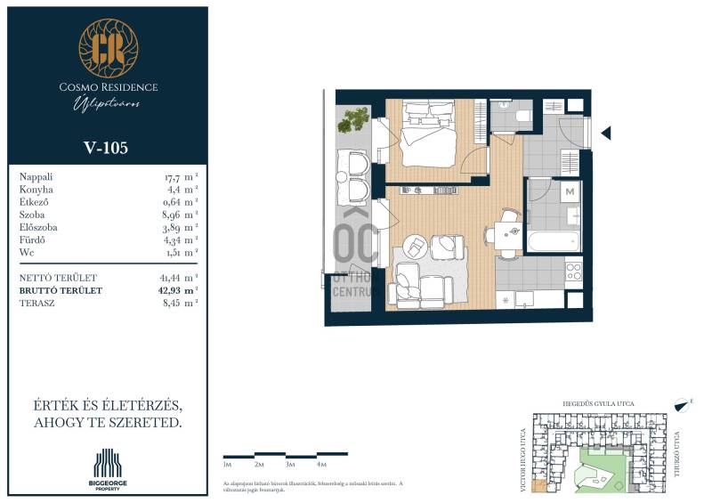 Projekt bemutatásaBudapest egyik legvonzóbb és legkeresettebb városrészében, Újlipótváros szívében egy új, exkluzív lakópark épül: az Cosmo Residence. A Hegedűs Gyula, Visegrádi, Victor Hugo és Thurzó utcák által körülhatárolt területen elhelyezkedő ingatlanfejlesztés a városrész ikonikus, nagypolgári hangulatát ötvözi, modern életstílussal, magas színvonalú építészeti megoldásokkal és első osztályú kényelemmel.A Cosmo Residence nemcsak egy újabb lakópark – hanem egy életstílus, amely a belvárosi pezsgést és a nyugodt, zöld környezetet egyaránt biztosítja lakóinak. Az ingatlan 2027. első felére készül el, és összesen 230 változatos méretű és elrendezésű lakást kínál, a 32 m2-es stúdiólakásoktól kezdve egészen a tágas, 125 m2-es, nappali + három hálószobás lakásokig. A legtöbb lakás erkéllyel rendelkezik, a legfelső szinten pedig exkluzív penthouse lakások várják azokat, akik a privát tetőterasz nyújtotta különleges panorámát szeretnék élvezni.A lakások tervezésekor több mint 4000 vevői visszajelzést vettünk figyelembe, így a terek és elrendezések maximálisan alkalmazkodnak a mai modern élet igényeihez. A belső kialakítások során lehetőség van egyedi igények figyelembevételére is, amit belsőépítészeti kollekciók segítenek. A 8 szintes épületben változatos méretű üzlethelyiségek is kialakításra kerülnek, melyek a földszinten kapnak helyet, további kényelmet biztosítva a lakók számára.A Biggeorge Property legújabb fejlesztése, a Cosmo Residence Budapest 13. kerületének közkedvelt helyszínén, Újlipótváros szívében épül, a Hegedűs Gyula, Visegrádi, Victor Hugo és Thurzó utca által határolt területen. A környék hangulatát tükröző épület 230 energiahatékony otthont kínál, amelyek megfelelnek a legújabb környezettudatos elvárásoknak. A fejlesztés részeként üzletek, tárolók és gépkocsi-beállók is kialakításra kerülnek, amelyek tovább növelik az épület lakóinak kényelmét.