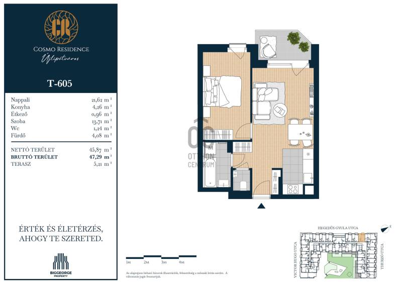 Projekt bemutatásaBudapest egyik legvonzóbb és legkeresettebb városrészében, Újlipótváros szívében egy új, exkluzív lakópark épül: az Cosmo Residence. A Hegedűs Gyula, Visegrádi, Victor Hugo és Thurzó utcák által körülhatárolt területen elhelyezkedő ingatlanfejlesztés a városrész ikonikus, nagypolgári hangulatát ötvözi, modern életstílussal, magas színvonalú építészeti megoldásokkal és első osztályú kényelemmel.A Cosmo Residence nemcsak egy újabb lakópark – hanem egy életstílus, amely a belvárosi pezsgést és a nyugodt, zöld környezetet egyaránt biztosítja lakóinak. Az ingatlan 2027. első felére készül el, és összesen 230 változatos méretű és elrendezésű lakást kínál, a 32 m2-es stúdiólakásoktól kezdve egészen a tágas, 125 m2-es, nappali + három hálószobás lakásokig. A legtöbb lakás erkéllyel rendelkezik, a legfelső szinten pedig exkluzív penthouse lakások várják azokat, akik a privát tetőterasz nyújtotta különleges panorámát szeretnék élvezni.A lakások tervezésekor több mint 4000 vevői visszajelzést vettünk figyelembe, így a terek és elrendezések maximálisan alkalmazkodnak a mai modern élet igényeihez. A belső kialakítások során lehetőség van egyedi igények figyelembevételére is, amit belsőépítészeti kollekciók segítenek. A 8 szintes épületben változatos méretű üzlethelyiségek is kialakításra kerülnek, melyek a földszinten kapnak helyet, további kényelmet biztosítva a lakók számára.A Biggeorge Property legújabb fejlesztése, a Cosmo Residence Budapest 13. kerületének közkedvelt helyszínén, Újlipótváros szívében épül, a Hegedűs Gyula, Visegrádi, Victor Hugo és Thurzó utca által határolt területen. A környék hangulatát tükröző épület 230 energiahatékony otthont kínál, amelyek megfelelnek a legújabb környezettudatos elvárásoknak. A fejlesztés részeként üzletek, tárolók és gépkocsi-beállók is kialakításra kerülnek, amelyek tovább növelik az épület lakóinak kényelmét.