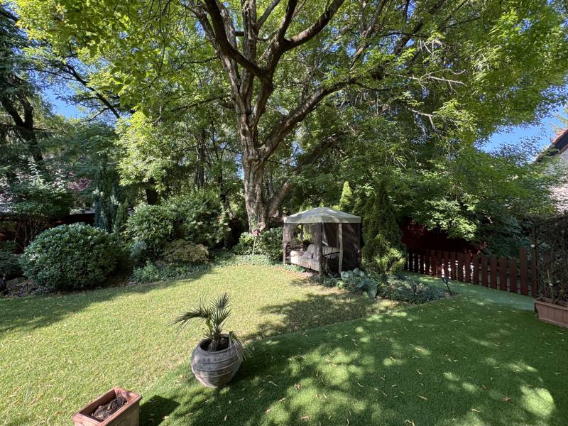 Egy igazán különleges, 280 m²-es, nappali + 3 hálószobás ikerház eladó a II A. kerület egyik legcsendesebb, legzöldebb részén, 450 m²-es, sík, intim kerttel, kulturált, rendezett környéken.Az ingatlan három szinten kínál tágas, világos, élhető tereket. Az ikerház másik felének külön bejárata van egy másik utcáról, így a két házrész teljesen elszeparált – nincs átjárás, nincs átlátás, a privát szféra maximálisan biztosított.A ház főbb jellemzői:•Hatalmas, kertkapcsolatos nappali amerikai konyhával és étkezővel•3 hálószoba + dolgozósarok + beépített tetőtér stúdió jelleggel (konyhával, fürdőszobával, külön lakrészként is használható)•Wellness rész: jakuzzi, finn és infraszauna•Redőnyös, napfényes ablakok, légkondicionált helyiségek•Padlófűtés és radiátoros fűtés kombinációja•Több vendégmosdó, valamint dupla mosdós, ablakos fürdőszoba•2 gardrób helyiség•Vadregényes, parkosított kert örökzöldekkel, díszcserjékkel•Vadonat új Viessmann gázkazán•Beépített spájz, ami még a hűtőszekrényt is elnyeli•Teljes alápincézés, ahol helyet kapott:•3 állásos fűtött garázs•háztartási helyiség, mosókonyha, borospince, tárolók•kazánház és vasalószobaKörnyék:A környék kivételesen nyugodt, zöldövezeti elhelyezkedésű, zömében családi házas övezet, csendes zsákutcában. Kiváló közlekedés és infrastruktúra, iskolák – többek között a Francia Iskola is – rövid távolságon belül elérhetők, ugyanakkor a belváros zaja távol marad.Ez az otthon azoknak szól, akik a kiváló elhelyezkedésen túl egy olyan házat keresnek, ahol a kényelem, az átgondolt terek és a diszkrét luxus természetes alapfeltétel.