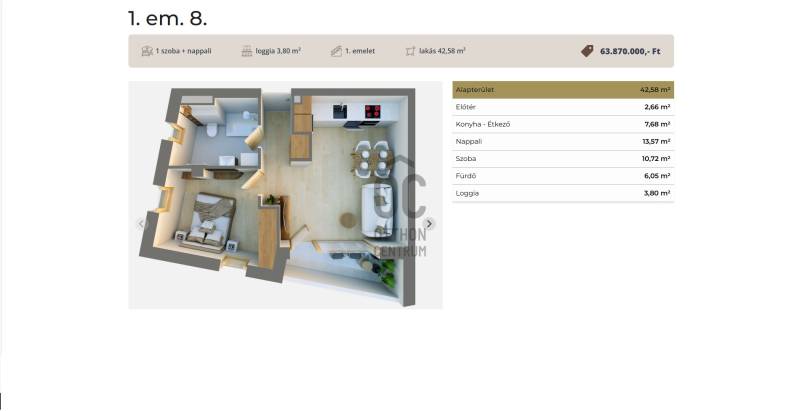 Debrecen frekventált városrészében, a Postakertben új építésű, 37-75 nm-es prémium lakások eladók. A 17 lakásos, liftes, 3 emeletes épületben a privát kertkapcsolatos lakásoktól a penthousig mindent megtalál.Ez az 1. emeleti lakás 42,58 nm-es, nappali-étkező-konyha +1 szobás, 3,8 nm-es loggiával.Jellemzők:-Kulcsrakész, precíz kivitelezés, magas színvonalú burkolatokkal és szaniterekkel-Hőszivattyús fűtési rendszer padlófűtéssel, hőszivattyús klímák- Modern hőközpont, lakásokban egyedi rádiós almérőkkel-3 rétegű műanyag nyílászárók a kiváló hő- és hangszigetelés érdekében-Extra hőmegtartó képességű innovatív, Porotherm X-therm tégla falazat, grafitos homlokzati hőszigeteléssel-Személyfelvonó-Zárt lépcsőház, modern homlokzat-Kiváló energetikai besorolás, alacsony fenntartási költségek-Riasztórendszer előkészítés-Rejtett redőnytok elektromos kiállással-Tágas, világos belső terek prémium nyílászárókkal-Teremgarázs beállók, tárolók-Lift közvetlen eléréssel a parkoló szintrőlIskola, óvoda,tömegközlekedési lehetőségek a közelben, a belváros gyalogosan is megközelíthető. Autópálya felhajtó, bevásárló központok 3 perc autóútra vannak. Ideális választás családoknak, pároknak vagy befektetőknek. Ha új építésű, energiatakarékos, kulcsrakész otthonra vágyik zöld környezetben, ne hagyja ki ezt a lehetőséget!Projekt bemutatása-