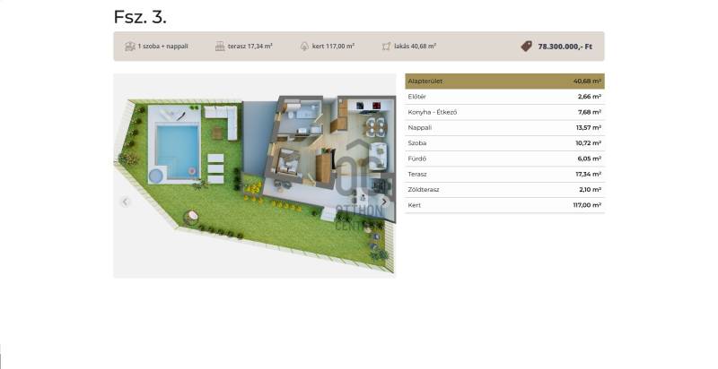 Debrecen frekventált városrészében, a Postakertben új építésű, 37-75 nm-es prémium lakások eladók. A 17 lakásos, liftes, 3 emeletes épületben a privát kertkapcsolatos lakásoktól a penthousig mindent megtalál.Ez a földszinti kertkapcsolatos lakás 40,68 nm-es, nappali-étkező-konyha +1 szobás, 17 nm-es terasszal és 117 nm-es kerttel.Jellemzők:-Kulcsrakész, precíz kivitelezés, magas színvonalú burkolatokkal és szaniterekkel-Hőszivattyús fűtési rendszer padlófűtéssel, hőszivattyús klímák- Modern hőközpont, lakásokban egyedi rádiós almérőkkel-3 rétegű műanyag nyílászárók a kiváló hő- és hangszigetelés érdekében-Extra hőmegtartó képességű innovatív, Porotherm X-therm tégla falazat, grafitos homlokzati hőszigeteléssel-Személyfelvonó-Zárt lépcsőház, modern homlokzat-Kiváló energetikai besorolás, alacsony fenntartási költségek-Riasztórendszer előkészítés-Rejtett redőnytok elektromos kiállással-Tágas, világos belső terek prémium nyílászárókkal-Teremgarázs beállók, tárolók-Lift közvetlen eléréssel a parkoló szintrőlIskola, óvoda,tömegközlekedési lehetőségek a közelben, a belváros gyalogosan is megközelíthető. Autópálya felhajtó, bevásárló központok 3 perc autóútra vannak. Ideális választás családoknak, pároknak vagy befektetőknek. Ha új építésű, energiatakarékos, kulcsrakész otthonra vágyik zöld környezetben, ne hagyja ki ezt a lehetőséget!Projekt bemutatása-