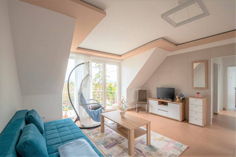 Kiváló befektetés 900 méterre a Balaton legjobbnak választott strandjától! 4 lakásból álló apartman ház földszinti és tetőtéri lakásai külön-külön vagy egyben céggel együtt is eladók.A földszinti lakás: 68,07 m2 + 61,56 m2 terasz fele + 1 felszíni gépkocsibeálló. Ára: 104,99 millió Ft.A tetőtéri lakás: 63,87 m2 + 4,23 m2 erkély + 4,20 m2 tároló + 4,28 m2 erkély fele. + 1 felszíni gépkocsibeálló.Az épület 2022-ben épült korszerű építőanyagok felhasználásával. Lakásonként 1-1 db. kondenzációs, kombi gázcirkó biztosítja a radiátoros és padlófűtést valamint a meleg víz ellátást. A hűtést 3,5 KW-os, inverteres, hűtő-fűtő klímák biztosítják lakásonként. 3 rétegű, hő- és hangszigetelt, aranytölgy színű műanyag, homlokzati nyílászárók, redőnyök. Minőségi burkolatok, szaniterek, beépített bútorok, gépek és egyéb belsőépítészeti megoldások.Közös, parkosított 667 m2-es telek. Lakásonkét akár 2-2 db. gépkocsival is meg lehet állni a telken belül. Az ingatlanokat csak irodánk kínálatában találja. Hívjon bizalommal!