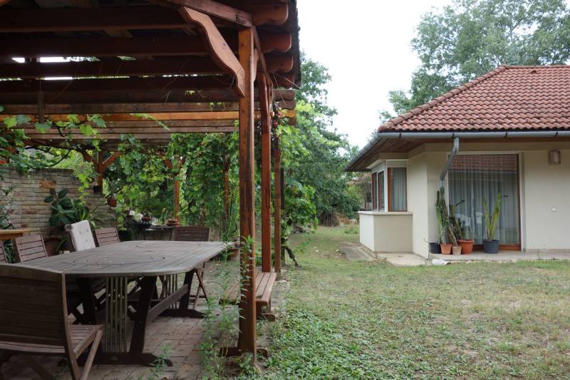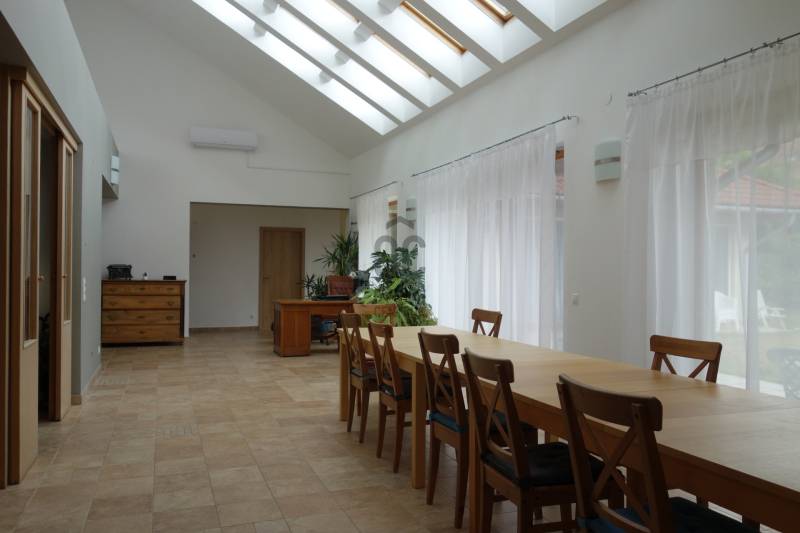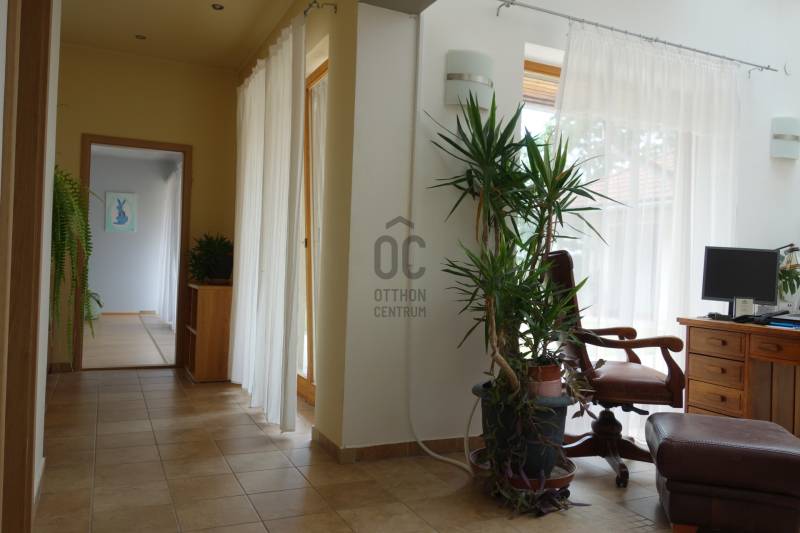 Mogyoródon a méltán kedvelt Szent Jakab lakóparkban eladósorba került egy gyönyörű családi ház. A dupla telken elhelyezkedő ingatlan 2003-ban épült.A körbejárható egy szintes házban nagy terekkel rendelkező otthon kiváló lehet nagyobb családoknak vagy akár több generáció összeköltözésére is. A közel 300nm-s házat 6 szobával, három fürdőszobával tulajdonosai a Feng Shui elvei szerint álmodtak meg. Ennek és az építészeti tervezésnek köszönhetően rendkívül jó energiája vana háznak. Nagy terek, tágas szobák és kényelmes - praktikus kialakítása minden korosztály számára a kényelmet szolgálja. Például mosókonyha, dolgozószoba,gardrobeszoba, fitnesszrészleg és a már beépített tetőteret tárolónak használva. Ez utóbbi tovább fejleszthető, lakótérként használható. Az igen tágas télikertjelenleg étkező-közösségi tér, tetőablakai nyithatóak. A házban akár két különálló lakrész is kialakítható, külön bejárattal. Ennek előkészítése megtörtént, ehhez csupán egy fal megépítése szükséges. Energetikailag kítűnő, besorolása EE, öko jellegű energiafelhasználással. Fűtését a két évvel ezelőtt telepített hőszivattyú, melegvízellátását egy kombi gázkazán biztosítja, mely fűtésre is alkalmas. A házban 4 db klíma található, a hidegburkolatos helyiségekben padlófűtés van. A gyönyörű ősfás nagy telek-kert kiválóan alkalmas családi összejövetelek megrendezésére és kertészkedésre egyaránt. Számos gyümölcsfa, kerti tó és grillező, illetve kemence a szaletli alatt, minden igényt kielégít. A kertben öntözőrendszer és egy kerti tó is kialakításra került. Egy nagyon helyes borospince is helyet kapott a kertben, ahol a család férfitagjai barátokkal elvonulhatnak. Az épület U alakú kialakításával közrefogott terasz és a kert szélvédett, napos. A két állásos garázs tágas, felette tároló kapott helyet. A lakópark nyugalmát őrző-védő szolgálat vigyázza. Nívóját beléptető rendszer és portaszolgálat emeli. A lakópark fenntartása mint közösköltség 25eFt havonta.Aki itt él, csendes, nyugodt zöld környezetben erdő mellett egy másfajta életminőséget tudhat a magáénak. Rendkívül jó a megközelítése, autóval 20-25 perc, hévvel 35perc alatt érhetjük el az Őrs Vezért terét. Tulajdonosai nagyon szeretnek itt élni, gyerekek kirepülése hozatta meg velük az eladás melletti döntést. Várom hívását, egy élmény lesz a bemutató is!
