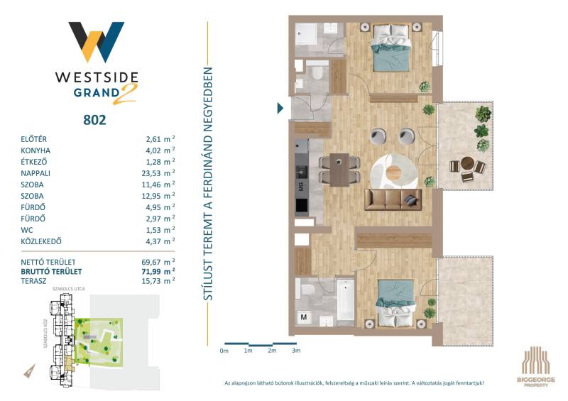 Projekt bemutatásaA projektrőlA Westside Grand I-II. a Biggeorge Property Westside fejlesztés sorozatának - a Westside Residence és a Westside Gardent követően - legújabb tagja.LokációBudapest egyik leggyorsabban fejlődő kerületének központi területén, a XIII. kerületben, a Városligettől és a megújuló Nyugati pályaudvartól sétatávolságra épül. A Nyugati pályaudvar környéke az elkövetkezendő években szinte teljesen megújul, a XIII. kerületben elhelyezkedő Szabolcs utcában, illetve közvetlen környezetében számos új építésű ingatlan épült, melyek jelentős értéknövekedést kínálnak a környéken ingatlant vásárlóknak. A több ütemben megvalósuló lakóingatlanfejlesztések hatalmas zöld parkot ölelnek körül, így a lakók akár az erkélyen ülve is élvezhetik a csendet, nyugalmat és zöld környezetet egy központi, belvárosi környezetben is.