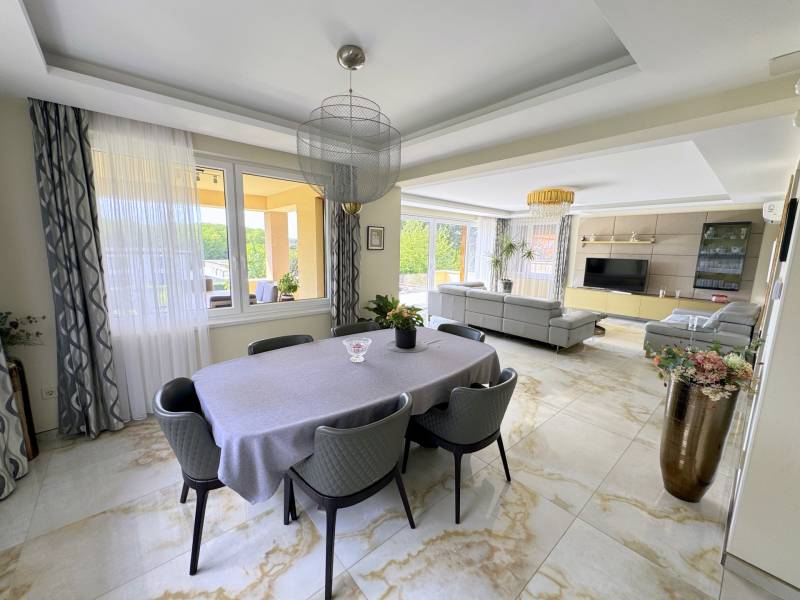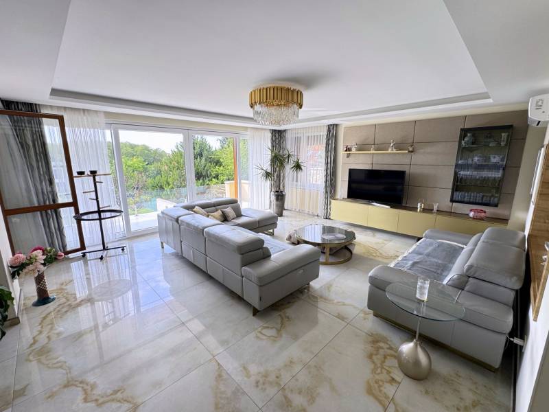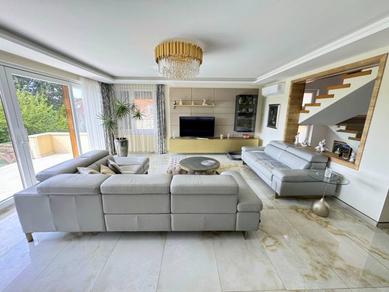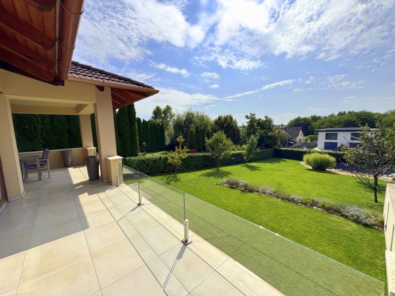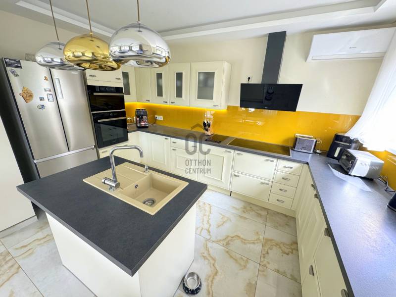 Gödöllőn eladóvá vált egy rendkívüli minőségben megépített 328nm-es, 7 szobás önálló családi ház 1200nm telekkel!A város központjához közeli Fenyves körzetben találod, impozáns környéken, ahol csak újszerű és űj építésű házakat találsz.Ez a prémium minőségű egyedi Otthon igazi ritkaság és csak olyanoknak ajánlom, akik a mediterrán stílusú meleg szineket kedvelik és a luxust.A három szinten mindent megtalálsz ami ahhoz kell, hogy kényelmesen, békében és biztonságban élhess családoddal.Akár az 5 hálószobáról, 4 fürdőszobáról vagy többi kiegészítő helyiségről legyen szó, itt mindenki megtalálja a számítását!+ A ház 2019-ben épült, 30-as Porotherm téglából, melyre 15cm szigetelés került. A födém teljes értékű, nagy teherbírású szigetelt beton födém, a padlástér tárolásra alkalmas és a tetősík is szigetelt.+ 10 kw-os napelem látja el a ház elektromos áram igényét, ez elegendő a teljes háztartás áramellátására, beleértve az elektromos autók töltését.+ A ház fűtését jelenleg gázkazán biztosítja, ám már megvásárlásra került egy új hőszivattyú, ami beszerelésre kész és a vételár részét képezi.+ A középső szinten padlófűtés van, a többi szinten radiátorok. Ezeket egészíti ki a fan-coil rendszerű hűtő-fűtő klíma minden helységben.+ Az alsó szinten kapott helyet egy nagy méretű háztartási helyiség és mosókonyha, egy kisebb, lépcső alatti tároló, egy közösségi tér, valamint egy további szoba saját fürdőszobával. Ezen túl még egy szauna és egy újabb fürdőszoba.+ A bejárati szinten lévő a két autó számára kényelmes, tágas garázsból az előszobába érkezünk, ahonnan egy vendégmosdó nyílik. Tovább haladva a ház többi részétől szeparált szoba található, mely remekül használható akár vendégszobaként vagy dolgozóként.+ Innen a tágas nappaliba juthatsz, ami mellett helyett kapott egy teljesen felszerelt szigettel is ellátott konyha-étkező. Ezen túl egy lenyűgöző kilátással ellátott erkély is növeli a komfort érzetet.+ A felső szinten három külön nyíló szoba erkély kapcsolattal, valamint két fürdőszoba található, egyikük közvetlenül az egyik hálószobából nyílik, így teljesen privát.További extrák: fürdésre alkalmas kerti tó, élménymedence, minden ablak szúnyoghálóval és redőnnyel felszerelt, riasztó rendszer, kapucsengő, központi porszívó, rengeteg beépített gardrób szekrény, autómata öntöző rendszer stb.Az ingatlan jogilag rendezett, akár hitelre is megvehető és akár 2-3 hónap alatt is költözhető. Bár az otthon start hitelre nem jogosult, hidd el sok extrái miatt megéri a piaci hitelt felvenni rá.Rengeteg érv szól e mellett a remek Otthon mellett, de inkább gyere el, nézd meg és szeress bele te is!