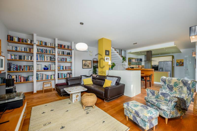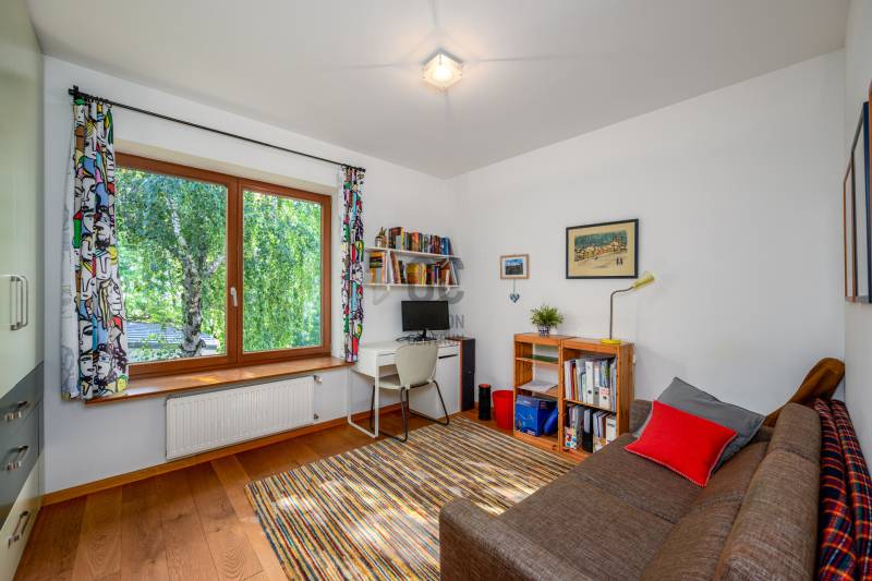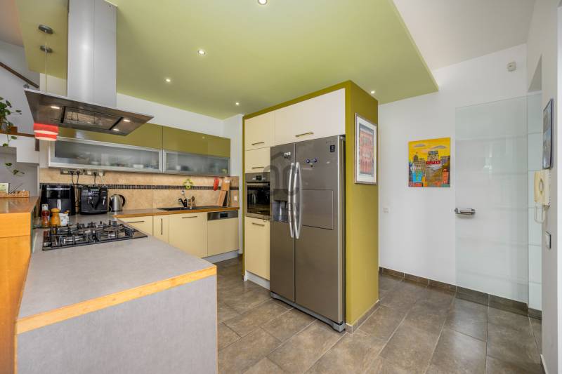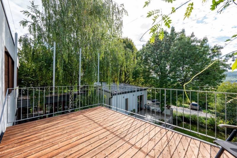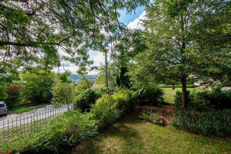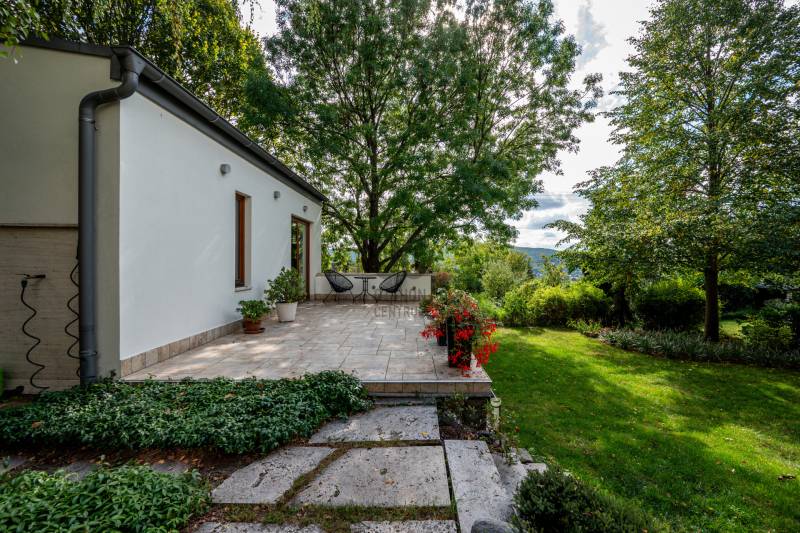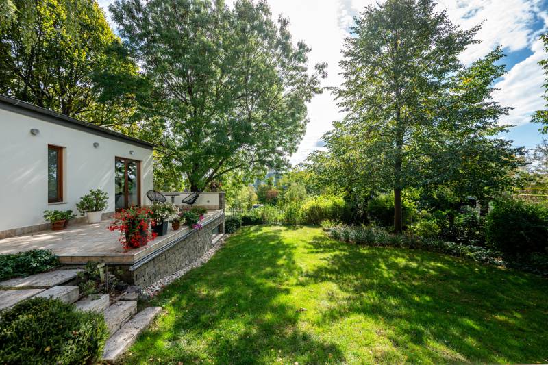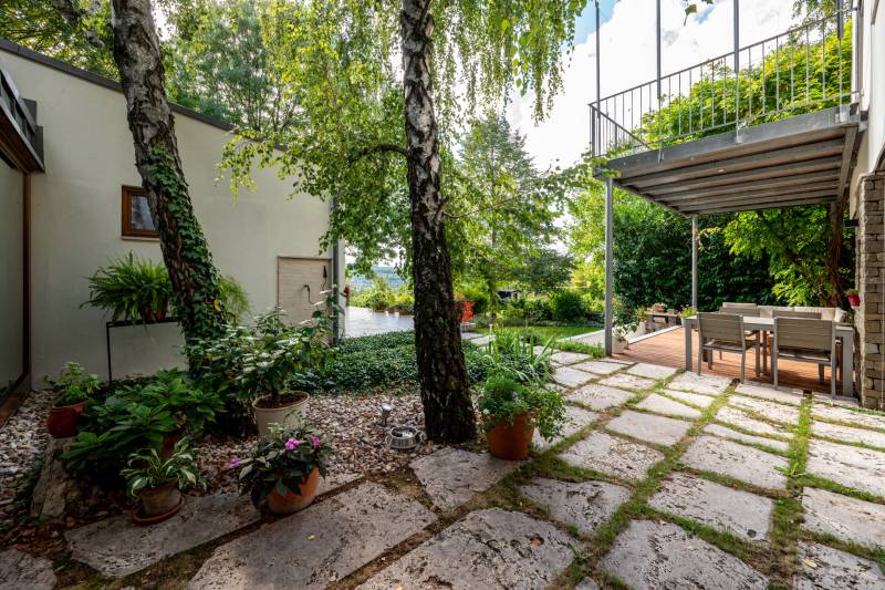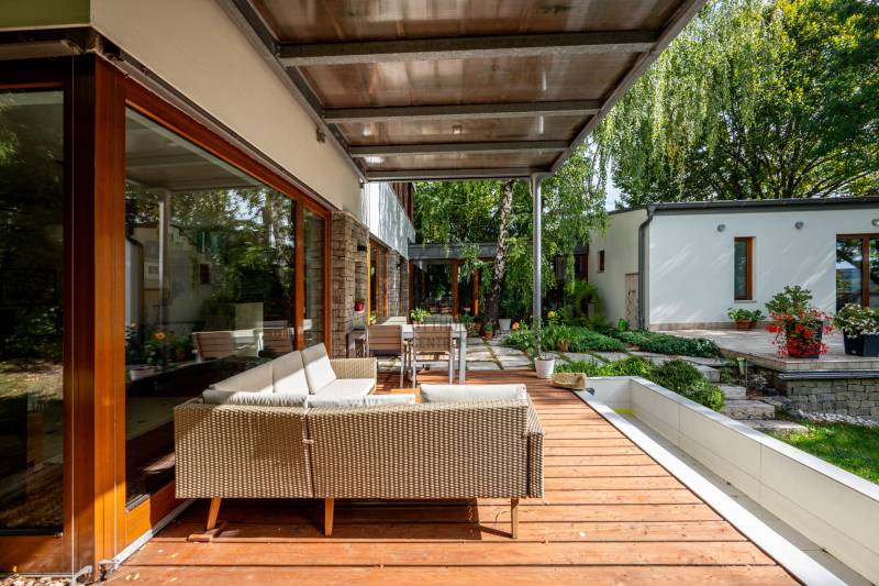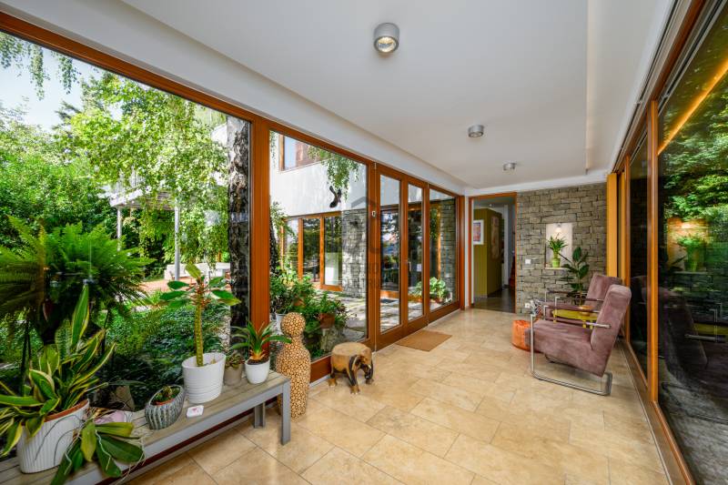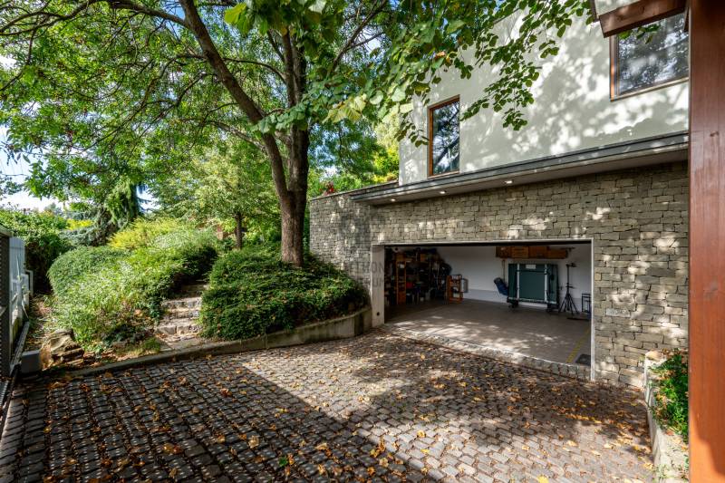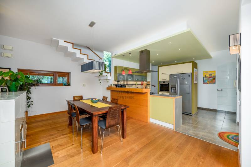 Lenyűgöző természetközeli luxus, ahol a design és a környezet tökéletes összhangot alkot!Nagykovácsi Cseresznyés részén áll ez a ház, melynek tervezésekor az volt a fő szempont, hogy a meglévő fák megmaradjanak – a végeredmény egy építészeti remekmű, ami körbeöleli az élő természetet. A fák árnyéka természetes hűtést és páratlan atmoszférát biztosít. A lehető legtöbb helyen hatalmas üvegfelületek engedik be a fényt és szinte elmossák a bel- és kültér közötti határokat. A ház egyik különleges építészeti megoldása a télikert, amely olyan érzetet nyújt, mintha közvetlenül a kertben sétálnánk.Mindezt a hatást fokozza a ház teraszairól elénk táruló csodás panoráma.Főbb paraméterek:- 237 m2 nettó alapterület- 2 lakószint + szuterénszinten a garázs- nappali + 4 szobaA szobák elosztása lehetővé teszi különböző generációk elkülönülését- 3 fürdőszoba + 2 kézmosós wc- fűtés: kondenzációs kazán, (szobákban radiátor, nappali-étkezőben padlófűtés), 3 db hűtő-fűtő split klíma, nappaliban cserépkályha- parkolás: 2 állásos garázs + nyitott beálló- 24 m2 fedett terasz- 11 m2 nyitott terasz- 17,8 m2 erkélyMűszaki paraméterek:- Porotherm 30 külső falazat+ 15 cm hőszigetelés- tető: VM-Zinc horganylemez- 3 rétegű fa nyílászárók - tölgy svédpadló padló- és lépcsőburkolatok- furnérozott tölgy belső ajtók- teraszok burkolata: kerámia, vörösfenyő, travertin mészkő- tetőn 5,3 kW-os napelemrendszer- automata öntözőrendszer- kerti csobogó- kerti tárolóAjánljuk 4-5 fős családoknak vagy nagyszülőkkel összeköltözőknek.Ha szeretné megtekinteni, várom hívását!