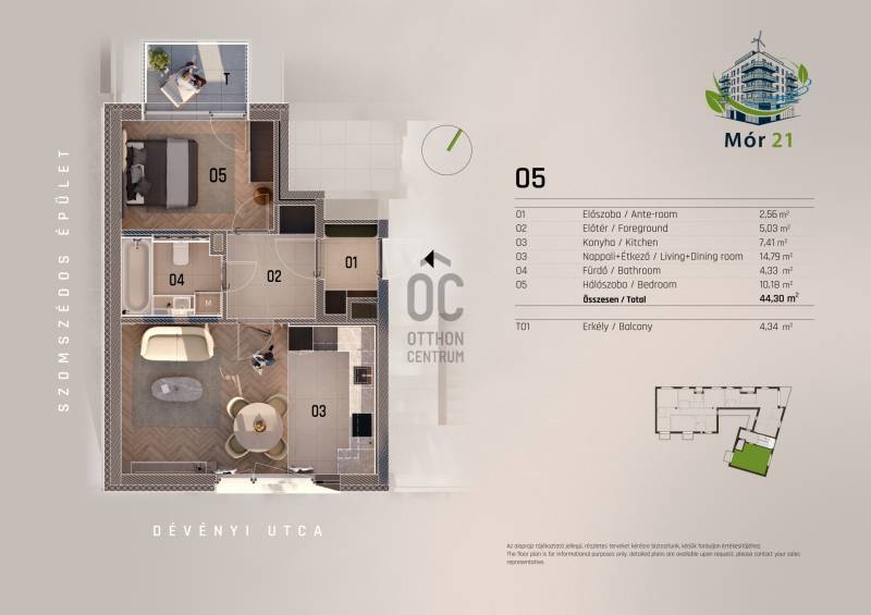 Projekt bemutatásaA Mór utca és Dévényi utca sarkán, egy hangulatos saroktelken épül fel ez a 23 lakásos, modern megjelenésű, mégis a környezetébe harmonikusan illeszkedő társasház. A kivitelezés során kiemelt figyelmet kapott a benapozás, a jól élhető terek kialakítása, valamint a magas műszaki tartalom.Az épület földszint + 5 emelet kialakítású, pinceszinttel, ahol teremgarázs és tárolók is helyet kaptak. Minden szinten ergonomikusan megtervezett, kiváló elosztású lakások találhatók, jellemzően 42–90 m² közötti alapterülettel. A legtöbb lakáshoz saját loggia, erkély vagy terasz tartozik – a felső szinten exkluzív nagy teraszos lakások kerültek kialakításra.A társasház minden szempontból megfelel a mai kor elvárásainak:– 23 parkolóhely (12 a pinceszinten, 11 a földszinten), Elektromos autó töltési lehetőséggel– 6 tároló,– zöldtető és közösségi tetőkert,– geotermikus hőszivattyús fűtés és hűtés,– padlófűtés, fan-coil hűtés,– háromrétegű nyílászárók, korszerű hő- és hangszigetelés,– liftes megközelítés minden szinten.Az épület anyaghasználata prémium minőségű: terrakotta árnyalatú burkolólapok, világosszürke betonhatású elemek és szignálfehér falfelületek teszik igazán különlegessé a házat.A kiváló infrastruktúrájú környék – Jász utca, Lehel út, Róbert Károly körút, M3-as közelsége – garantálja a gyors közlekedést, míg a környező parkok, új fejlesztések és szolgáltatások emelik a lakók életminőségét.Ez a projekt ideális választás lehet városi otthont keresőknek, tudatos befektetőknek és azoknak, akik értékelik a magas minőséget és az élhető, modern lakókörnyezetet.