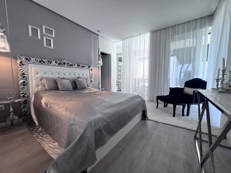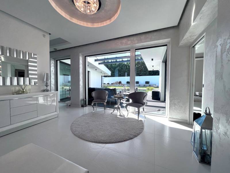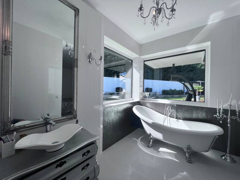 Megvételre kínálunk, egy újszerű, kompromisszummentes, kiváló adottságokkal rendelkező, egyszintes, minimalista jegyekkel épült, 220 nm- alapterületű, nappali+3 hálószobás modern családi házat kétállásos garázzsal.A Lake Forest villaparkot egy Magyarországon egyedülálló vízió hozta létre, mégpedig egy erdő közepén elterülő letisztult és mintaszerű Modern családi házas környezet, a Villapark közepén kialakított 7000 nm-es dísztóval.A ház gondosan megtervezett, mind külső jegyei, mind a belső enteriőr vonzza a tekintetet. Prémium minőségű, építészeti megoldások mellett, magas műszaki tartalommal épült, a praktikum és az elegancia ihlette.A házról:A házba lépve már az előtérben szemet gyönyörködtető, az üveg felületeknek köszönhetően elénk táruló, a házat körülvevő privát kert és Bio tó. Az előtérből jobbra található az Amerikai konyhás nappali, szintén körbe üveg felülettel, egyedi gyártású, teljesen gépesített, prémium minőségű konyhabútorral. Az étkezőasztal mögött kapott helyet egy Bioetanol beépített látványkandalló is, ami szeparálja a pihenő nappalit, a páratlan, saját tóra és teraszra tájolva. A nappali a hálószobáktól teljesen elkülönül, a gondos tervezésnek köszönhetően.Az előtértől balra a közlekedőn át található egy vendég wc, tovább a gardrób szoba, melyből nyílik egy tágas kádas, ablakos fürdőszoba wc-vel. A közlekedőn át haladva az üvegfelületeken át az egész kert és a tó is elénk tárul, miközben elérjük a két külön nyíló gyermekszobát, továbbá a mosókonyhát. A gyermekszobák és a szülői háló között található a dolgozószoba, majd a szülői háló, saját gardróbbal, privát terasszal és fürdőszobával. Minden szobája kertkapcsolatos, a kert intimitása teret ad az aktív pihenésnek, mindezeken túl tetőterasz is kialakításra került.Komfort:A házban a 2 fürdőszobán túl további vendég wc és zuhany is kialakításra került.Műszaki tartalom:A ház falazata, 30 cm-es Porotherm falazat amely 20 cm-es Austrotherm Grafit fokozott hőszigeteléssel lett ellátva. A ház építése során a munkafolyamatok dokumentálva lettek, bővebb műszaki tájékoztatással személyesen állunk szíves rendelkezésükre.A gépészet:A fűtés padló és falfűtéssel lett kialakítva, a helyiségekben inverteles klíma berendezések biztosítják a hűtést-fűtést, a ház központi vízlágyító és víztisztító rendszerrel lett kiépítve. 10.5 kw teljesítményű napelem rendszer biztosítja a ház energiatakarékos fenntartását.Luxus kategóriájú Olasz hideg burkolatok kerültek beépítésre a fürdőszobákban és a közlekedőn, valamint a nappaliban. A szobákban egyedi színre pácolt tölgyfa parketta került, prémium szaniterekkel, csaptelepekkel, egyedi gyártású nyílászárókkal.Kert :A hatalmas Telek, lehetőséget nyújtott egy csodás privát kert, kényelmes terasz modern WPC burkolattal, saját BIO tó, grill terasz bioklimatikus motoros, vízálló pergolával (mely körbe LED világítással van felszerelve), a házhoz kapcsolódó tároló épület, kialakítására. A telek V-alakú formájából adódóan a hátsó kert tágas, egyedi méretének köszönhetően kellően nyugodt magánszférát és intimitást nyújt az otthon eltöltött pihenésnél. Mára a zöld növényzet a dísznövények, a kert összképe magával ragadó, a Leendő Tulajdonosnak már csak a fenntartására kell energiát fordítania.A kert fenntartáshoz szükséges ROBOMOW önjáró fűnyíró és a Bio tó tisztításához szükséges DOLPHIN medence tisztító is a vételár részét képezik.Berendezés:Szinte a teljes berendezésre, bútorzatra a leendő tulajdonos igényt tarthat, már csak élveznie kell az új Otthona kényelmét.További felmerülő kérdéseivel forduljon hozzám bizalommal, megtekintés rugalmasan, előre egyeztetett időpontban.Ferge Imre