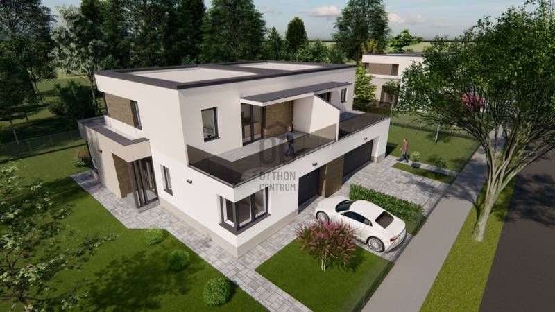 Képzeljen el egy otthont, ahol a modern építészet és a természet harmóniája találkozik. Debrecen-Józsa legújabb lakóparkja különlegessége, hogy a terület korábban botanikus kertként működött, ennek varázslatos hangulata ma is átjárja a környéket. A gazdag növényzet és a gondosan parkosított környezet biztosítja a természet közelségét és a mindennapok nyugalmát.A lakópark csendes utcáiban a gyerekek biztonságosan játszhatnak, biciklizhetnek, miközben a család a zöld környezet nyugalmát élvezheti.Alapterület: 177 m²Lakótér: 108 m²Szintek: földszint + emeletSzobák száma: 4 + nappaliGarázs: 1 autós, közvetlen belső kapcsolattalTelekrész: saját használatú 450 nmElrendezésA modern, lapostetős ikerház átgondolt alaprajzzal rendelkezik:Földszint: világos nappali étkező-konyhával és kamrával, egy hálószoba, fürdőszoba, külön WC, háztartási helyiség, előszoba, egygépkocsis garázs, valamint 22,4 m²-es terasz.Emelet: három hálószoba, két fürdőszoba, közlekedő, és 23,3 m²-es erkély.Műszaki tartalom (kiemelt jellemzők)Szerkezet: Porotherm 30 N+F tégla, 15–20 cm hőszigetelésselTetőszerkezet: lapostető, egyenes rétegrenddel, kavicsolt felülettelNyílászárók: 6 légkamrás, 3 rétegű üvegezéssel (Uw=0,9 W/m²K), kívül antracit, belül fehérÁrnyékolás: motoros redőny előkészítésGarázskapu: motoros, hőszigetelt szekcionált kapu, 2 távirányítóvalBurkolatok: laminált padló 7.500 Ft/m²-ig, kerámia 10.000 Ft/m²-ig választhatóFürdőszoba felszereltség: Hansgrohe csaptelepek, Wellis szaniterek, Macryl Eco kád, Ravak zuhanyfalFűtés-hűtés: levegő-víz hőszivattyú, padlófűtés + mennyezethűtés, nappaliban klímaSzellőzés: hővisszanyerős szellőztető rendszerBiztonság: komplett riasztórendszer előkészítveExtrákKörbekerített lakópark, úszókapuval, kizárólag lakók részéreBiztonságos magánutca, ahol a gyerekek felszabadultan játszhatnakTágas terasz és erkély, ideális családi és baráti összejövetelekhezÚj építésű, energiatakarékos otthon modern gépészettelEgyedülálló zöld környezet a volt botanikus kert helyénHa Ön is egy modern, energiatakarékos otthonra vágyik a természet ölelésében, biztonságos, családbarát környezetben, ne habozzon!Hívjon most, és biztosítsa be helyét a Green Living Lakópark különleges otthonai között._ MAGASTETŐS KIVITELBEN IS VÁLASZTHATÓ: 186.970 HUF. _