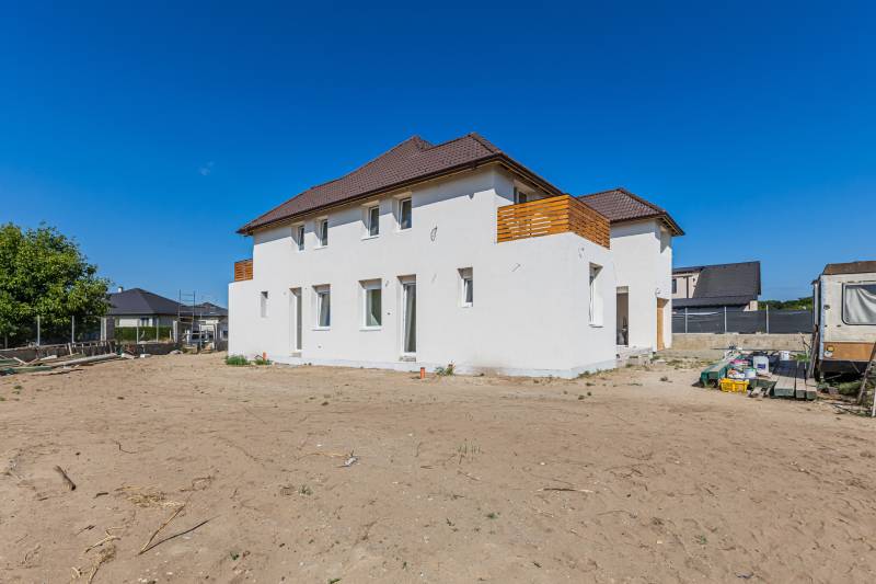KIEMELT AJÁNLAT!Kiváló referenciákkal!A fényképeken korábban értékesített referenciák láthatók. A látványtervek és a telekről készült képek mutatják a jelenlegi ingatlant.ÚJONNAN ÉPÜLŐ LAKÓPARKBAN, a Waldorf iskolától 2 utcára épül ez az ÚJÉPÍTÉSŰ IKERHÁZ.Egymással mindössze egy tárolónál érintkezve, teljesen SZEPARÁLT KERTRÉSZEKKEL.A helyiek által kedvelt CSENDES, ZÖLD UTCÁBAN, KITŰNŐ MINŐSÉGBEN készül, 460 m2 saját telken.Itt biztosan megtalálja a nyugalmat, aki arra vágyik.Ezen a területen nincsenek és nem is lesznek látható kábelek, ez egy rendezett, újonnan épülő lakópark.Az épület 40cm vastag fallal épül, műanyag nyílászárókkal 3 rétegű hőszigetelt üvegezéssel, Terrán Zenit Resistor Onix tetőcserép fedéssel, hőszivattyú kiállással, padlófűtéssel, napelem-, riasztó-, és klímaelőkészítéssel, illetve egy klíma egységgel a nappaliban.A hálószobákba laminált padló, a többi helyiségbe járólap kerül, de ez most még igény szerint módosítható.A FŰTÉSE és a FENNTARTÁSA KEDVEZŐ, a korábbi referenciákkal kapcsolatos tapasztalatok alapján a TELJES HAVI REZSI legfeljebb 40-45 ezer forint, és napelemmel REZSIMENTES tud lenni az ingatlan.Napelem beszerzését és kedvezményes beszerelését az ár megbeszélés alapján tartalmazhatja.Fúrt kút is található a telken, bemért, iható vízzel.Csatorna kiépítése után az utca és a környék is aszfaltozva lesz.Az építés jelenleg is zajlik, ezért a BURKOLATOKAT Ön még KIVÁLASZTHATJA, igényeit megadhatja, így a lehető legjobb időben van.Az egyik fél már elkelt, a másik még elérhető.Nettó 99 m2 lakótér, nappali+2 szoba, 2 fürdőszoba és garázs.Igény szerint a garázs még kérhető szobaként, akkor nappali+3 hálószobás lesz az ingatlan, ebben az esetben egy fedett, viacolorozott autóbeállót is tartalmaz az ár.10 percen belül szinte minden elérhető: busz, ovi, suli, boltok posta, cukrászda, virágos, gyógyszertár, benzinkút, stb.ÁTADÁS 2026. május 31-ig, igény szerint hamarabb.Minimum 10 % foglalóval és 20% önerővel LEKÖTHETŐ.CSOK, Hitel, Babaváró és illeték visszatérítés igényelhető rá.Nagyon jó választás mind az ingatlan, mind a lokáció.Hívjon bizalommal a hét bármely napján!Amennyiben saját ingatlanja eladásához a mi irodánkat választja, ezt minőségi szolgáltatások és kedvező feltételek mellett vállaljuk.Az ingatlan CSOK igénybevétele esetén illetékmentes!CSOK, Babaváró, Lakásfelújtás, Támogatott hitelek? Irodánk minden állami támogatás és lakáshitel igény kapcsán DÍJMENTES és SZAKÉRTŐ segítséget nyújt!Igény szerint profi ügyvédi hátteret is biztosítunk.