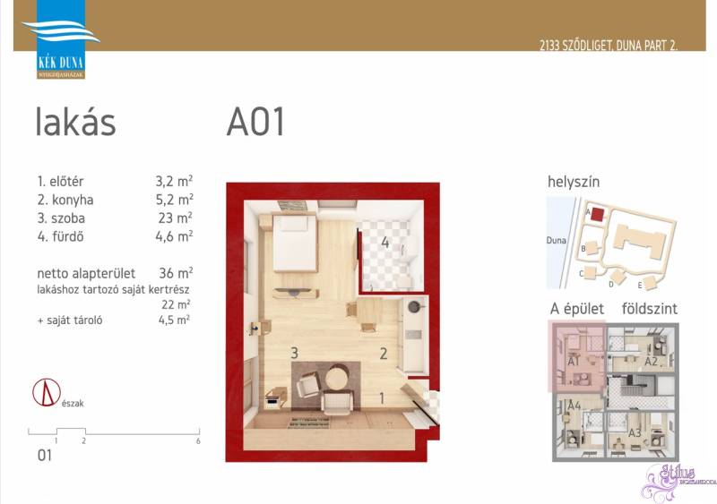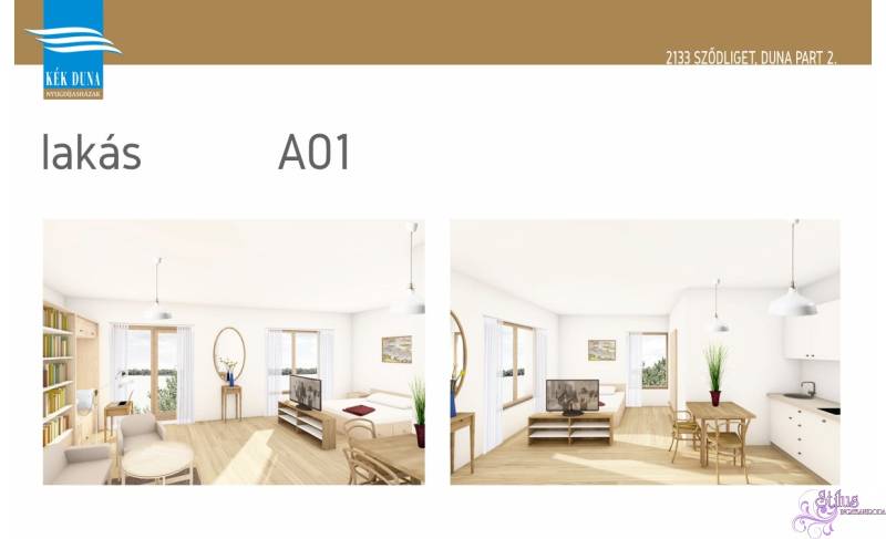 „Nyugdíjasház - Egy biztonságos jövőért”Sződliget Duna-partján épülő lakóparkba vitalitással teli, pozitív gondolkodású fiatal nyugdíjasokat várnak. A Kék Duna Nyugdíjasházak egy olyan prémium lakópark lesz, ahol a lakhatáson túl, a nyugdíjas életvitelhez szükséges szolgáltatásokat is meg lehet kapni helyben, a Kék Duna Otthonból.Az itt lakók életmódja annyiban különbözik majd egy máshol élő ember életmódjától, hogy:•egyszerűen és gyorsan juthatnak orvosi, ápolási és műszaki segítséghez, ha szükségét érzik•biztonsági szolgálattal védett, bekerített területen élhetnek, ahová csak olyan ember léphet be, akit a portaszolgálat beazonosított,•ezen a védett területen sok mindent el tudnak intézni anélkül, hogy el kellene hagyniuk itteni környezetüket,•különlegesen szép természeti környezetben, a Dunakanyarban, dunai panorámával, egy támogató közösségben élhetnekAz akadálymentesített, liftes, 20 lakásos (szintenként 4 lakás) társasházban 5 lakószint és egy pinceszint (tárolókkal) kerül kialakításra.A házak szerkezete monolit vasbeton födémekkel és vasbeton pillérrel készülnek. A külső falak 30 cm-es (erre kerül 20 cm szigetelés), a belső válaszfalak 10 cm-es porotherm téglából épülnek.A fűtést és a hűtést napelemmel támogatott levegő-víz hőszivattyú végzi padlófűtéssel, illetve falra szerelt (fan-coil) hőleadóval. A Nyugdíjasházak úgy épülnek, hogy a rezsi költség alacsonyan tartható legyen.A házak tájolásakor különösen ügyeltek arra, hogy a dunai panoráma minden lakásból a lehető legjobban érvényesüljön.A hirdetésben feltüntetett lakás (A01) a földszinten található. 36 nm alapterületű, melyhez 11 nm-es terasz és kb. 22 nm-es saját használatú kert tartozik Az ingatlanban amerikai konyhás nappali, háló és fürdőszoba kerül kialakításra. Igény szerint a háló leválasztható. Észak-Nyugati fekvésének és nagy nyílászáróinak köszönhetően szép világos, napos.Társasházban ilyen típusú lakás:1. emeleten (A11): 36 nm alapterületű, 2,8 nm-es erkéllyel 60.400.000.-Ft2. emeleten (A21): 36 nm alapterületű, 2,8 nm-es erkéllyel 62.000.000.-Ft3. emeleten (A31): 36 nm alapterületű, francia erkéllyel 62.200.000.-FtAz emeleti ingatlanokból csodaszép panoráma élvezhető!További lakástípusok a kínálatomban megtalálhatóak. Árak fekvéstől és elhelyezkedéstől függően: 54,5- 68,9 MFT-ig.Minden lakáshoz beépített, gépesített (2-es főzőlap, mikrohullámú sütő, páraelszívó és hűtőszekrény) konyhabútor, saját használatú (5,4-5,6 nm-es) tároló és igény szerint felszíni kocsibeálló is tartozik, melyeket a vételár tartalmaz.A kivitelezés ebben az évben elindul. A lakások átadása 2026. IV. negyedévére várható, de már most leköthetőek!A Nyugdíjasházak munkatársai rendszeresen szerveznek majd csoportos programokat, pl. kirándulást, színházlátogatást, házi-mozit, családi napokat, szüreti napot és karácsonyi programokat.A társasház tömegközlekedéssel is jól megközelíthető. A Budapest-Vác busz megállója 300 méterre, a Sződligeti vasútállomás 1,5 km-re található.A Kék Duna Nyugdíjasház célja, hogy az az itt élőknek lehetővé tegye, hogy biztonságban, tartalmasan, segítő, pozitív közösségben töltsék nyugdíjas éveiket. Ez az életforma teljes szabadságot jelent majd az itt lakóknak. Ha viszont egészségi állapotuk miatt segítségre szorulnak, az sem jelent majd gondot, minden segítséget elérhetnek házon belül.Szívből ajánlom, ha Ön is vágyik egy ilyen környezetre és egy biztonságos idős korra!