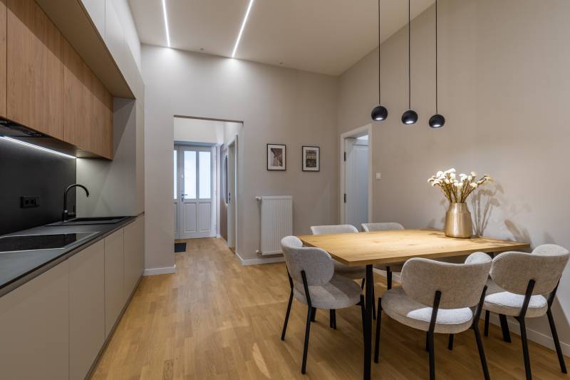 A klasszikus terek és a modern kényelem harmóniája. Üdv itthon!RÖVID ÖSSZEFOGLALÓBudapest V. kerületében, Hild tér mellett, a méltán kedvelt Október 6. utcában, 1845-ban épült, lift nélküli, kívül jó, belül átlagos, a lépcsőház pedig átlagon aluli állapotú társasház 2. emeletén, 102 m² alapterületű,utcára néző, nappali + 3 hálószobás, 2 fürdőszobás, kiváló állapotú, azonnal költözhető lakás. Ízléses, hangulatos, igazi otthon.LOKÁCIÓ – A város középpontjábanA múltat idéző, építészeti remekművek adta környezet a város lüktető szíve. Éttermek, kávézók, üzletek sokasága várja az itt élőket. Egyszerre kínál kulturális gazdagságot, kényelmet és inspiráló városi életérzést. A Duna-part, Szabadság tér, Erzsébet tér, Deák Ferenc tér, Bazilika 2 perc sétatávolságon belül.Benn vagyunk a központban mindenhez közel. Mindig tudunk magunknak izgalmas programot találni:- esti séta a Duna-parton- borbár a barátokkal- színház a kedvesünkkel- shoppingolás- kávé valamelyik helyi kávézóban- reggeli brunch az ArtizánbanA sort hosszasan lehetne folytatni.A kiváló elhelyezkedéséhez nem fér kétség, a kényelmes, biztonságos környezet garantált!AZ ÉPÜLET – Történelmi érték, rendezett miliőA XIX. század közepén épült társasház a klasszikus belvárosi polgári építészet egyik ékes példája. A homlokzat méltóságot sugároz, a tágas belső udvar hangulatos atmoszférát teremt, a lépcsőház pedig őrzi a korabeli építészeti részleteket. Bár lift nem található benne, a második emeleti elhelyezkedés könnyedén megközelíthető, ami tovább erősíti a klasszikus polgári jelleg autentikus hangulatát.Parkolni a környező utcákban (fizetős övezet) vagy bérléssel lehetséges.LAKÁS – Kortárs elegancia polgári alapokonA lakás teljes felújítása során a polgári szerkezet nagyvonalú arányait ötvözték a modern otthonok kényelmével és kifinomult esztétikájával. A nappali világos, tágas tér, amelyet a nagyméretű ablakokon át beáradó fény és a visszafogott színek harmóniája tesz különlegessé. A konyha elegáns fekete és natúr fa kombinációban készült, beépített gépekkel és rejtett világítással, amely egyszerre esztétikus és funkcionális. A három különnyíló hálószoba neutrális tónusokkal és természetes fa padlóval biztosít nyugodt, kiegyensúlyozott atmoszférát. A két fürdőszoba olasz burkolatokkal, modern szaniterekkel és LED-világítással készült – egyik káddal, másik walk-in zuhannyal, a legmagasabb komfortérzetet kínálva.MIÉRT KÜLÖNLEGES? Az utcára néző ablakokból minden nap a belváros gazdagon díszített homlokzatai tárulnak fel. Ez a látvány folyamatos párbeszédet teremt a lakás modern, letisztult belső világával: a klasszikus polgári építészet részletei és a kortárs design tiszta vonalai együttese ad különleges élményt, amely egyszerre idézi meg a múlt értékeit és a jelen kifinomultságát.MEGHÍVÓEz a 102 m²-es belvárosi lakás a klasszikus polgári hangulat és a modern elegancia tökéletes egysége. Egy olyan otthon, amely a város közepén biztosítja a kifinomult életteret, időtálló értéket képvisel és méltó választás mindazok számára, akik a belváros legjobb adottságait keresik.----------------------------------Díjmentes, bankfüggetlen hiteltanácsadással támogatjuk vevő ügyfeleinket a számukra legelőnyösebb finanszírozási döntések meghozatalában. Opcionálisan igénybe vehető kiegészítő szolgáltatásainkkal – mint ügyvédi közreműködés, energetikai tanúsítvány vagy villamos biztonsági felülvizsgálat – teljes körű szakmai támogatást nyújtunk az adásvétel folyamatának minden egyes lépésénél.A hirdetésben szereplő információk tájékoztató jellegűek. A tévedés és az árváltoztatás jogát fenntartjuk. Az esetleges elírásokért és technikai hibákért felelősséget nem vállalunk.Spacious Period Apartment in the Heart of DowntownWhere classical proportions meet modern comfort. Welcome home!SHORT OVERVIEWFor sale in Budapest’s 5th district, next to Hild Square, on the highly sought-after Október 6. Street: a 102 m² apartment located on the 2nd floor of a classic, 1845-built residential building (no elevator).The building’s exterior is in good condition, while the staircase and common areas are average to below average.The property itself is in excellent condition and ready to move into.It features a spacious living room, three separate bedrooms, two bathrooms, and street-facing windows.Elegant, warm, and truly feels like home.LOCATION – In the Heart of the CityA neighbourhood that captures the essence of historic Budapest — surrounded by architectural masterpieces, vibrant city life, and a rich cultural scene.Cafés, restaurants, and boutiques are just around the corner, offering both comfort and inspiration for urban living.The Danube River, Szabadság Square, Erzsébet Square, Deák Ferenc Square, and the Basilica are all within a 2-minute walk.Living here means being at the centre of everything — with endless possibilities just steps away:An evening stroll along the DanubeWine bar with friendsTheatre night with your loved oneA bit of shoppingCoffee at a local caféBrunch at Artizán Bakery…and the list goes on.The location speaks for itself: a safe, convenient, and elegant environment in one of the most desirable parts of the city.THE BUILDING – Historic Charm, Timeless AtmosphereBuilt in the mid-19th century, this classic townhouse is a fine example of downtown bourgeois architecture.The façade radiates dignity, the spacious inner courtyard creates a pleasant, intimate atmosphere, and the staircase retains original architectural details from the era.Although there is no lift, the second-floor location is easily accessible, preservin