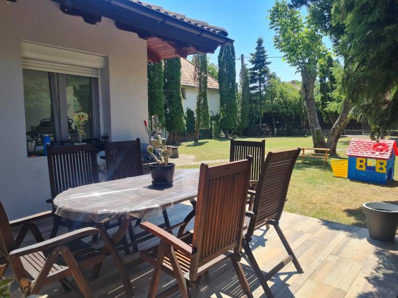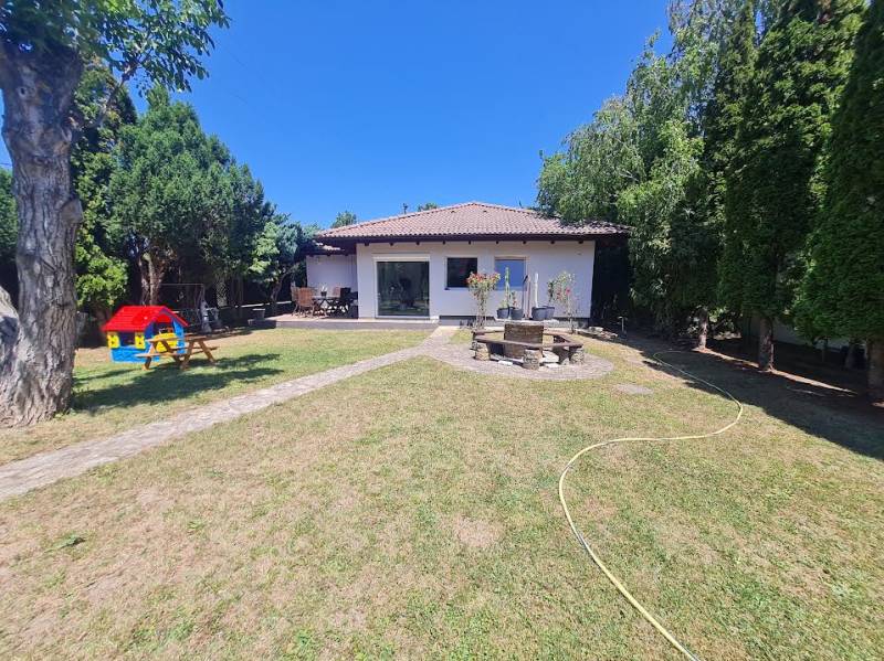 Pomázon gyönyörű környezetben nagy 654 m2-es összközműves sík telken eladó ez a földszintes, 2000-ben épült 4 szobás önálló családi ház.5 m-es belmagasságú, a mennyezet igényes faburkolatú.Az amerikai konyhás nappali terasz és kertkapcsolatos, ebből nyílik a 3 hálószoba és a fürdőszoba. Külön kamra, szép terasz és fedett kocsibeálló, és kerti sütögető tartozik még a házhoz.A nappaliban hűtő-fűtő légkondicionáló berendezés van, a ház fűtése gázkazánnal történik, padló és radiátoros fűtéssel.A gázátalány 20.000 Ft/hó, a ház teljes rezsije kb. 45.000 Ft.Műanyag 3 rétegű nyílászárók lettek beépítve szellőztetővel, 15 cm-es szigetelés van a házon.A konyhabútor igényes, sok elemes, konyhasziget is tartozik hozzá.A ház tehermentes, 1/1 es tulajdonú..A telek nagysága miatt a ház elé igény szerint egy gyönyörű medence építhető.