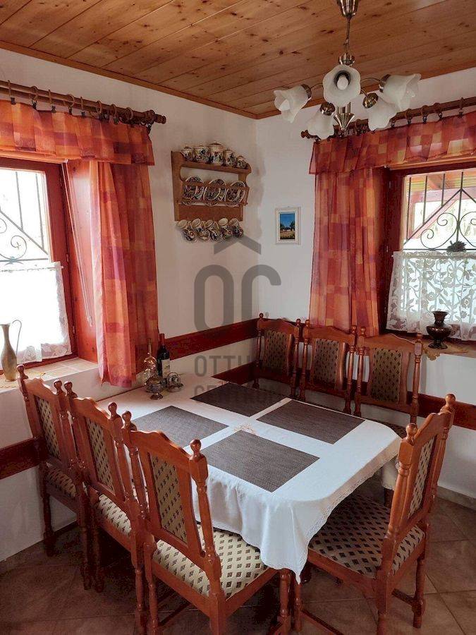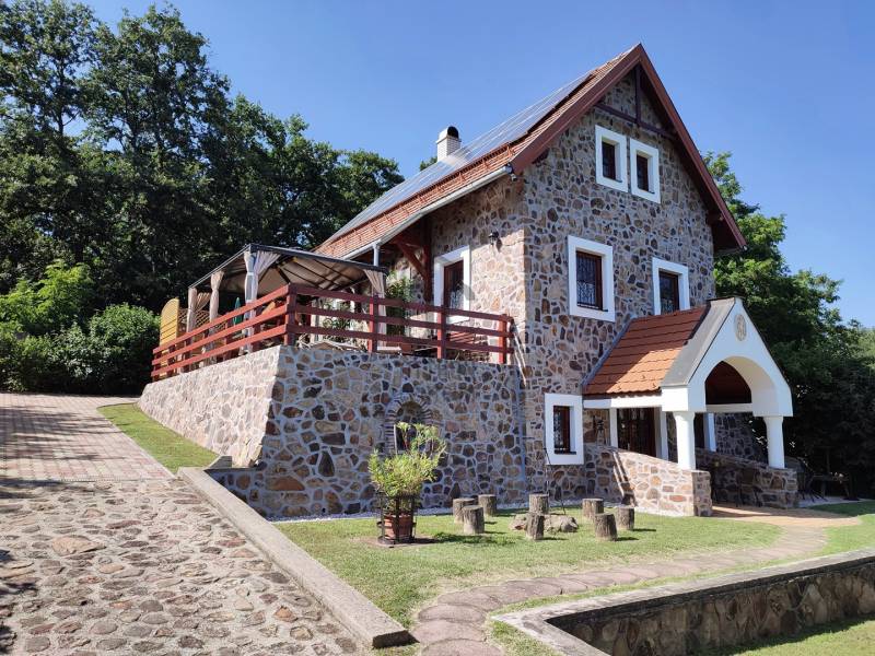 KIEMELT MEGBÍZÁS AZ OTTHON CENTRUM KÍNÁLATÁBAN!Ábrahámhegy festői környezetben a Balaton északi partján a nyugat felől magasodó Örsi hegy és a Tapolcai-medence tanúhegyeinek karéjában fekszik. A táj ősidők óta hazája a szőlőnek és a bornak és a nyári időszakban itt található a környék egyik legkedveltebb fürdőhelye is.A település egyik legmagasabb pontján vált eladóvá ez a különleges kialakítású, Balaton-felvidéki hangulatot árasztó ingatlan a hozzá tartozó 2067 m²-es szőlős területtel.A terület télen-nyáron jól járható úton közelíthető meg, teljesen körbekerített. A telekre betelepített Szürkebarát szőlő folyamatosan gondozott, karbantartott. Az utcafronti részt terméskő kerítés határolja, ez a kőmunka folytatódik az autófeljárón és a támfalakon, valamint a ház egészét is helyi \"vöröskő\" burkolja körbe, így kölcsönözve egyedi és tájba illő hangulatot a birtoknak.A gazdasági épületként bejegyzett ház 2005-ben épült, 3 szinten összesen 146 m²-es hasznos területtel rendelkezik. Az 50 cm-es kő-tégla falakkal rendelkező masszív épület szintjei épületen belül átjárhatóak. A házba hűtő-fűtő klímák kerültek betelepítésre, melyek áramellátását a kiépített napelemrendszer biztosítja, ezenfelül a fűtés a ház alsó- és földszinti részén fatüzelésű kályha használatával is kiegészíthető.A ház szintenkénti elosztása:Alsó szint: konyha, étkező, nappali/ háló, fürdőszoba, tároló, egyedi kialakítású, hangulatos borospinceFöldszint: nappali, étkező, konyha, fürdőszoba, lépcsőház és terasz.Emelet: 3 hálószoba és előszobaA házban riasztórendszer került kiépítésre. Az áram valamint a vezetékes víz bevezetésre került, szennyvíz derítő áll rendelkezésre a szennyvízelvezetéshez. Az esővíz gyűjtésére 2 ciszterna is kialakításra került, melyekből a locsolás könnyedén megoldható.A földszinti részhez kapcsolódó - nyári időszakban plusz életteret biztosító - hatalmas teraszról, de a telekről és a ház egészéből is teljes rálátást kapunk az előttünk elterülő Balaton vizére!A zárt parkolórészen és fedett kocsibeállón több autó egyidejű parkolása is lehetséges.Ajánlom az ingatlant mindazok figyelmébe,akik a \"béke szigetét\" keresik távol a mindennapoktól. A ház tökéletes nyaralónak, turisztikai befektetésként is vonzó lehet és állandó lakhatásra is alkalmas!Amennyiben kérdése merülne fel az ingatlannal kapcsolatban vagy szeretné azt megtekinteni, kérem keressen a megadott elérhetőségek egyikén!