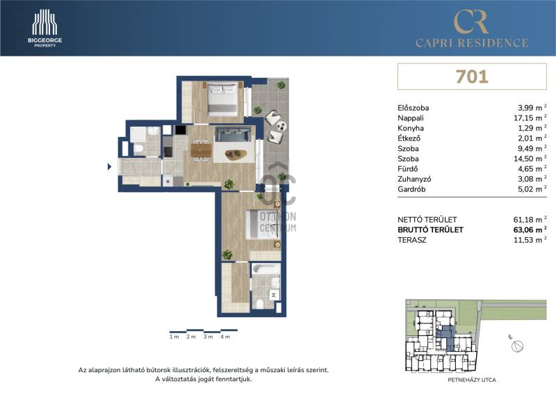 Projekt bemutatásaA Capri Residence a XIII. kerület szívében, a dinamikusan fejlődő Váci út közvetlen közelében valósul meg, amely Budapest egyik legkeresettebb lakáspiaci területe. Az elegáns, modern megjelenésű épületet, a homlokzatán végigfutó üvegkorlátos teraszok díszítik majd, a felsőbb szinteken pedig nagyteraszos lakások is elérhetők, amelyek egy része panorámás kilátást biztosít.Az épületben összesen 112 lakás kap helyet, amelyek elrendezése a stúdiótól a nappali plusz három hálószobásig terjednek. Az épületben emellett egy közösségi tér, 122 parkolóhely, 62 tároló, valamint opcionálisan elektromos autótöltővel szerelt teremgarázs beállók is megépítésre kerülnek.A műszaki felszereltség a legmagasabb szakmai trendeket követi: a Capri Residence lakóinak kényelmét mennyezeti hűtés-fűtés, háromrétegű üvegezéssel ellátott műanyag nyílászárók, smart-home előkészítés, valamint belsőépítész által összeállított belső anyagválaszték biztosítja majd. A földszinti lakásokhoz privát kertkapcsolat tartozik, emellett a társasház közös díszkerttel is rendelkezik.