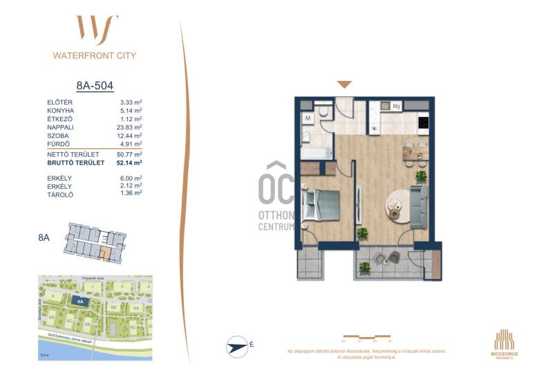 Projekt bemutatásaA projektrőlA Waterfront City egy új, modern városnegyed a 3. kerületben, ahol a természet közelsége és a városi kényelem tökéletes egyensúlyban van. A Duna-part közvetlen szomszédságában elhelyezkedő fejlesztés különleges atmoszférát kínál: a sétányt új épületek határolják, üzletekkel, kávézókkal és szolgáltatásokkal, amelyek élhető közösségi teret teremtenek.A 13 emeletes lakóépületből lenyűgöző örökpanoráma nyílik a budai hegyekre és a folyóra, a tágas teraszok pedig ideálisak a pihenéshez vagy a baráti összejövetelekhez. A zöldtetők, parkosított terek és fenntartható megoldások – mint az energiatakarékos rendszerek és okos otthon funkciók – mind hozzájárulnak a modern, környezettudatos életstílushoz.Látogass el értékesítési irodánkba, és tekintsd meg a városnegyed makettjét személyesen! Ismerd meg, milyen lesz az élet Budapest egyik legizgalmasabb új fejlesztésében!Óbuda szívébenKépzeld el, ahogy egy napsütéses délelőttön Óbuda szívében sétálsz, a Duna közelsége frissítően hat rád, miközben a Folyamőr utca, a Miklós tér és a Bogdáni út által határolt, öt hektáros területre érsz. A levegőben ott van a város történelme, mégis minden részletében a jövő hívogat.A 50 000 négyzetméteres területen egy hangulatos sétány vezet végig, amely egyenesen az óbudai Fő térre visz – mindössze 600 méterre. Ez a sétány nem csupán összeköt, hanem élményt nyújt: a Kolosy térről induló Óbudai Promenád részeként a város egyik legélhetőbb, legpezsgőbb szakaszán haladsz végig. És ha biciklivel érkeznél? A nemzetközi kerékpárút is itt halad el, Szentendre felé vezetve.Az 5. ütemben épülő 149 lakás mindegyike egyedi hangulatot kínál. Ahogy belépsz egy-egy otthonba, a hatalmas üvegfelületeken át beáradó fény és a tágas, szellős terek azonnal magukkal ragadnak. A kilátás? A Kaszap István park zöldje nyújt békét, míg a felsőbb emeletekről a Budai-hegység örökpanorámája tárul eléd – minden nap egy új festmény az ablakodban.A 6. ütemben 316 modern lakás épül, tágas teraszokkal és lenyűgöző kilátással a Dunára és a budai hegyekre. A lakók kényelmét őrszolgálat, kamerarendszer, mélygarázs, vendéglátóhelyek, belső park, játszótér és E-autó töltők szolgálják. Ez a projekt utolsó üteme, amely még közvetlen Duna-parti kapcsolattal rendelkezik.