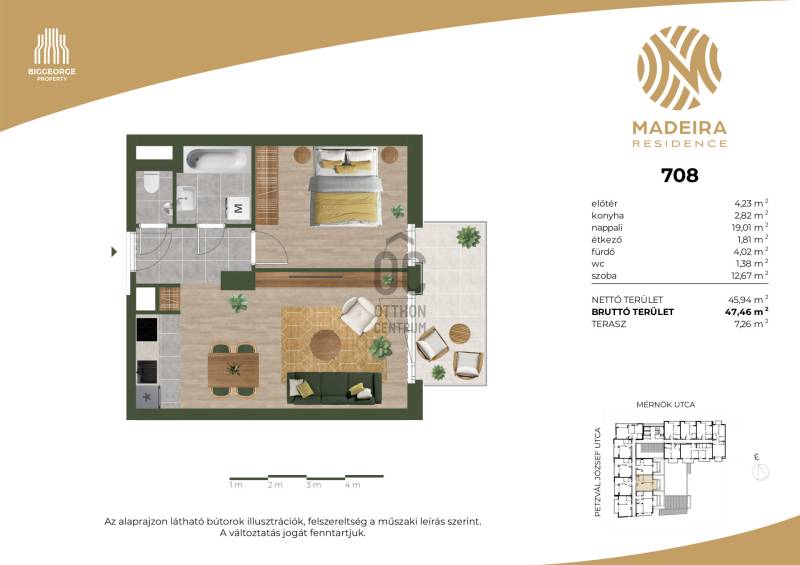 Projekt bemutatásaA projektrőlKépzeld el, ahogy belépsz Újbuda egyik legbékésebb, zöldövezeti utcájába, ahol a nyugalom átveszi a helyét a város zajos ritmusától. A Mérnök utcában, a Fehérvári út és az Etele út találkozásának közelében, egy elegánsan modern épület rajzolódik ki előtted – ez a Madeira Residence.Ahogy közelebb lépsz, a homlokzat letisztultsága, a loggiák ritmikus váltakozása azonnal megragadja a tekinteted. A pálcás korlátok finom eleganciát sugároznak, a napfény pedig játékosan tükröződik a teraszok üvegfelületein. Már kívülről is érezni: ez nem csupán egy lakóépület, hanem egy életérzés.Az első emeleti lakások egy része saját tetőkerttel rendelkezik – képzeld el, ahogy reggel a kávédat kortyolgatod a saját kis zöld oázisodban, miközben a madarak csicsergése tölti be a teret. Minden lakásban ott a tágas nappali, a kényelmes hálószobák, és a saját erkély vagy terasz, ahol a nap bármely szakában megpihenhetsz.A Madeira Residence nem csupán egy új építésű társasház – ez egy hely, ahol a modern életstílus találkozik a természet közelségével és a családbarát környezettel. Egy otthon, ahol minden nap élmény.A belső térben a kényelem és a fenntarthatóság kéz a kézben jár. A mennyezeti hűtés-fűtés rendszer csendesen gondoskodik a kellemes hőmérsékletről, az okosotthon-előkészítés pedig lehetővé teszi, hogy a technológia valóban a kényelmedet szolgálja. A mélygarázsban kényelmes parkolás vár, a kerékpártárolók és az elektromos autótöltési lehetőség pedig a környezettudatos életmódot támogatják.A környék infrastruktúrája kiváló: a közelben kiépített kerékpárutak, car sharing szolgáltatások és elektromos rollerek teszik egyszerűvé és fenntarthatóvá a közlekedést. A családosok számára külön öröm, hogy több játszótér is található a közelben – a gyerekek biztonságban, szabadon játszhatnak, miközben a szülők nyugodtan élvezhetik a környék nyugalmát.A Madeira Residence nem csupán egy új lakóépület – ez egy életérzés, ahol a mindennapok élménnyé válnak.