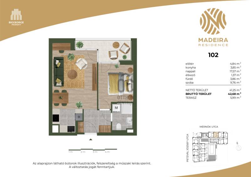 Projekt bemutatásaA projektrőlKépzeld el, ahogy belépsz Újbuda egyik legbékésebb, zöldövezeti utcájába, ahol a nyugalom átveszi a helyét a város zajos ritmusától. A Mérnök utcában, a Fehérvári út és az Etele út találkozásának közelében, egy elegánsan modern épület rajzolódik ki előtted – ez a Madeira Residence.Ahogy közelebb lépsz, a homlokzat letisztultsága, a loggiák ritmikus váltakozása azonnal megragadja a tekinteted. A pálcás korlátok finom eleganciát sugároznak, a napfény pedig játékosan tükröződik a teraszok üvegfelületein. Már kívülről is érezni: ez nem csupán egy lakóépület, hanem egy életérzés.Az első emeleti lakások egy része saját tetőkerttel rendelkezik – képzeld el, ahogy reggel a kávédat kortyolgatod a saját kis zöld oázisodban, miközben a madarak csicsergése tölti be a teret. Minden lakásban ott a tágas nappali, a kényelmes hálószobák, és a saját erkély vagy terasz, ahol a nap bármely szakában megpihenhetsz.A Madeira Residence nem csupán egy új építésű társasház – ez egy hely, ahol a modern életstílus találkozik a természet közelségével és a családbarát környezettel. Egy otthon, ahol minden nap élmény.A belső térben a kényelem és a fenntarthatóság kéz a kézben jár. A mennyezeti hűtés-fűtés rendszer csendesen gondoskodik a kellemes hőmérsékletről, az okosotthon-előkészítés pedig lehetővé teszi, hogy a technológia valóban a kényelmedet szolgálja. A mélygarázsban kényelmes parkolás vár, a kerékpártárolók és az elektromos autótöltési lehetőség pedig a környezettudatos életmódot támogatják.A környék infrastruktúrája kiváló: a közelben kiépített kerékpárutak, car sharing szolgáltatások és elektromos rollerek teszik egyszerűvé és fenntarthatóvá a közlekedést. A családosok számára külön öröm, hogy több játszótér is található a közelben – a gyerekek biztonságban, szabadon játszhatnak, miközben a szülők nyugodtan élvezhetik a környék nyugalmát.A Madeira Residence nem csupán egy új lakóépület – ez egy életérzés, ahol a mindennapok élménnyé válnak.