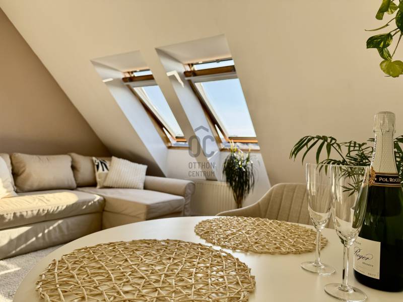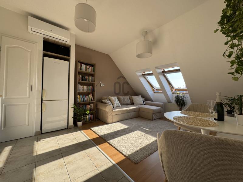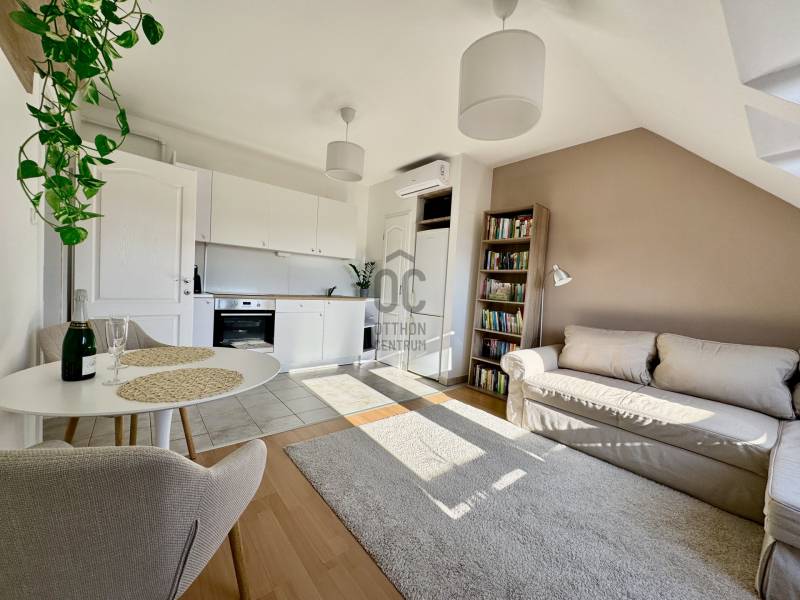 Újpest-központ metrómegállótól 3 perc sétatávolságra található, csendes sétálóutcában eladó tetőtéri ingatlan.A környék:5 perces sétatávolságon belül elérhető az újpesti piac, a Duna-part, metró, villamosmegálló, számos bevásárlási és szórakozási lehetőség. Tökéletes lokáció..Az épület:2003-ban épült, liftes, akadálymentes társasház, saját belső kerttel. A sétálóutcában nincs autóforgalom, teljes csend és madárcsicsergés fogadja az itt élőket.A lakás:Nettó 31nm, a 190cm alatti területekkel egütt 37nm-es, kiválóan karbantattott, tetőtéri ingatlan. Déli tájolásának köszönhetően rendkívül napos, meleg lakás. A fűtésről és melegvízről egy kombi-cirkó gondoskodik, a nyári időszakban egy náhány éve beszerelt klíma a felelős a megfelelő hőmérsékletért. A teljes bútorzat megegyezés tárgyát képezi.További kérdéssel, megtekintéssel kapcsolatban keressen bizalommal.