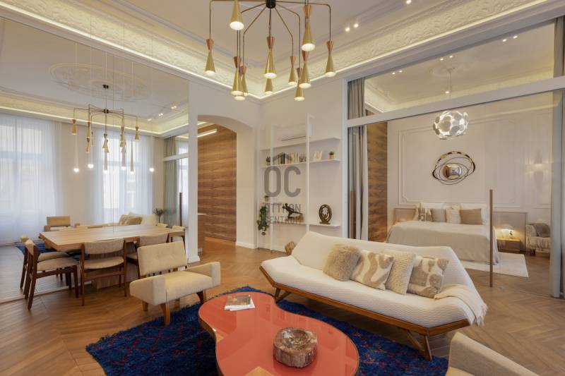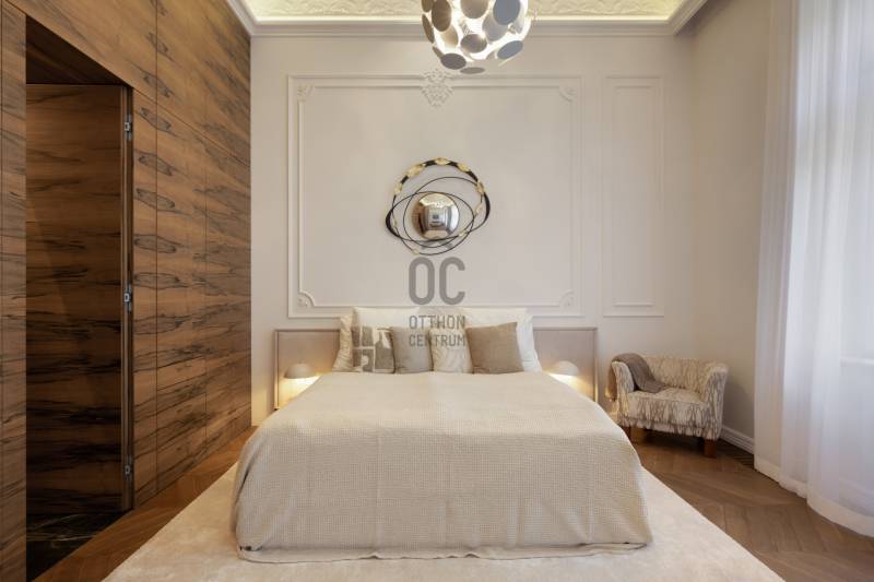 Felújított házban, kortárs polgári lakás. Üdv itthon! RÖVID ÖSSZEFOGLALÓBudapest V. kerületében, a Kálmán Imre utcában helyezkedik el ez az 1. emeleti, 80 négyzetméteres, felújított lakás. Három szoba, két fürdőszoba, erkély és déli tájolású, világos terek jellemzik, miközben a korszerű padlófűtés és a közös pincerész-használat a mindennapi komfortot szolgálja. Az ingatlan egy klasszikus nagypolgári épületben található.LOKÁCIÓ – INFRASTRUKTÚRA ÉS VÁROSI KULTÚRALipótváros ezen része azok közé a városi környezetek közé tartozik, ahol az infrastruktúra és a kulturális jelenlét természetes egységet alkot. Historikus bérházak, rendezett utcák és kiszámítható városi működés határozza meg a környezet karakterét.A városi tér szerves eleme a Kossuth Lajos tér és a Parlament, a Szabadság tér zöldfelületeivel és éttermeivel, valamint a Duna-part rakparti sétánya. A kulturális tengely szintén ide kapcsolódik: a Vígszínház, a Budapesti Operettszínház, a Thália Színház, illetve a Nagymező utca színházi világa a környék mindennapjainak része. Kávézók, üzletek és találkozópontok veszik körül a Szent István Bazilikát, miközben a közeli koncert- és zenei helyszínek tovább erősítik a városrész értelmiségi, művészeti hangulatát.Közlekedési szempontból a környék kiemelkedően jól szervezett: elérhető az M2-es és M3-as metró, a 4–6-os villamos, valamint több buszjárat, amelyek gyors kapcsolatot biztosítanak Pest és Buda irányába.Hosszú távon ez a városrész azért működik jól, mert nemcsak kiszolgál, hanem tartalmat is ad. Élhető, értelmezhető és stabil értéket képvisel, akár saját használatra, akár befektetési céllal.AZ ÉPÜLETKálmán Imre, az utca névadója a 20. század egyik legismertebb magyar zeneszerzője, az operett nemzetközi rangú alakja. Már a századfordulótól kezdve olyan közeg formálódott itt, amely értelmiségi, művészeti és közéleti szereplőknek adott otthont. Ez a háttér nem látványos, hanem rétegzett érték. Történettel, identitással és stabil presztízzsel bíró városi környezet, amely hosszú távon is működőképessé teszi az itt álló épületeket.A homlokzat a századfordulós lipótvárosi bérházépítés jellegzetes példája. A tagolt ablakrend, a hangsúlyos párkányok, az íves nyílászáró-lezárások és a kőkonzolokra ültetett erkélyek világos szerkesztési rendet követnek, miközben gazdag részletképzéssel dolgoznak. A díszítések nem dekoratív túlzások, hanem a korszak városi arányérzékét tükrözik: az épület egyszerre elegáns és fegyelmezett. Ez az a típusú homlokzat, amely nem trendekhez kötődik, hanem egy jól működő városi korszak építészeti gondolkodását őrzi.LAKÁSÁtgondolt alaprajz és természetes térkapcsolatok határozzák meg a lakás működését. A háromszobás elrendezés világosan elkülöníti a közösségi és a privát funkciókat, mégis egységes rendszert alkot.A nappali a lakás súlypontja, amelyhez szervesen kapcsolódik az étkező és a konyha. Jó arányú tér, nagy nyílászárókkal és déli tájolással, amely kiegyensúlyozott fényviszonyokat biztosít. A nappalihoz közvetlenül kapcsolódó erkély valódi kiegészítő térként jelenik meg. Pontosan azt tudja ez a tér, amit egy jól megkomponált nagypolgári nappalinak tudnia kell: érzelmileg hat, miközben megőrzi fegyelmezett karakterét. Magas belmagasság és finoman restaurált stukkódíszes mennyezet jelöli ki a tér rangját. A rejtett peremvilágítás keretezi a mennyezetet, míg a meleg tónusú függesztékek ritmust és hangsúlyt adnak a térnek. Klasszikus fali tagolás teremti meg azt a nyugodt hátteret, amelyben a bútorok és műtárgyak érvényesülni tudnak. A központi festmény fókuszt ad, majd visszavezeti a tekintetet a tér egészére.Parkettarajzolat földeli a teret, miközben a textíliák és a szőnyeg lakhatóvá teszik ezt az eleganciát. Nem reprezentációs díszlet, hanem valóban használható nappali: beszélgetésre, jelenlétre, lassulásra.Az összhatás ereje az egyensúlyban rejlik.Semmi nem akar több lenni annál, ami – és ettől válik igazán erőssé.Két, méretében és funkciójában is jól elkülönülő hálószoba teszi alkalmassá az ingatlant családi használatra vagy reprezentatív városi otthonként. Hangulatuk visszafogott és megnyugtató, a nagypolgári arányok modern értelmezésével. Mindkét háló saját fürdőszobai kapcsolattal rendelkezik, ami intim, jól szervezett működést biztosít, akár mindennapi használatra, akár vendégek fogadására.Az íves részletek, a puha textíliák és a finom világítás kiegyensúlyozott, csendes tereket hoznak létre, ahol a fókusz egyértelműen a pihenésen és a komforton marad.A két fürdőszoba anyaghasználatában és hangulatában is egységes, mégis eltérő karaktert képvisel: egyik kádas, világosabb tónusú, a másik zuhanyzós, mélyebb, elegáns felületekkel. A természetes kőhatású burkolatok, az egyedi asztalos bútorok és a finom világítás nyugodt, időtálló atmoszférát teremtenek a mindennapokhoz. Praktikus elhelyezkedésükkel kényelmes, torlódásmentes működést biztosítanak.Teljes körű felújítás során a hangsúly a korszerű műszaki megoldásokon és az időtálló belső kialakításon volt. A padlófűtés egyenletes hőérzetet ad, miközben vizuálisan is szabadon hagyja a falakat és tereket.Közös pincerész használata egészíti ki a lakást, amely praktikus tárolási lehetőséget jelent a belvárosi elhelyezkedés mellett.Ez az otthon kiegyensúlyozott, jól használható terekre épít, amelyek hosszú távon is élhetők maradnak – akár saját lakhatásra, akár minőségi befektetésként, bérbeadás céljából.Ha olyan belvárosi lakást k