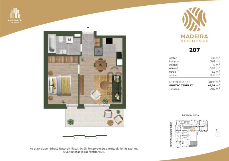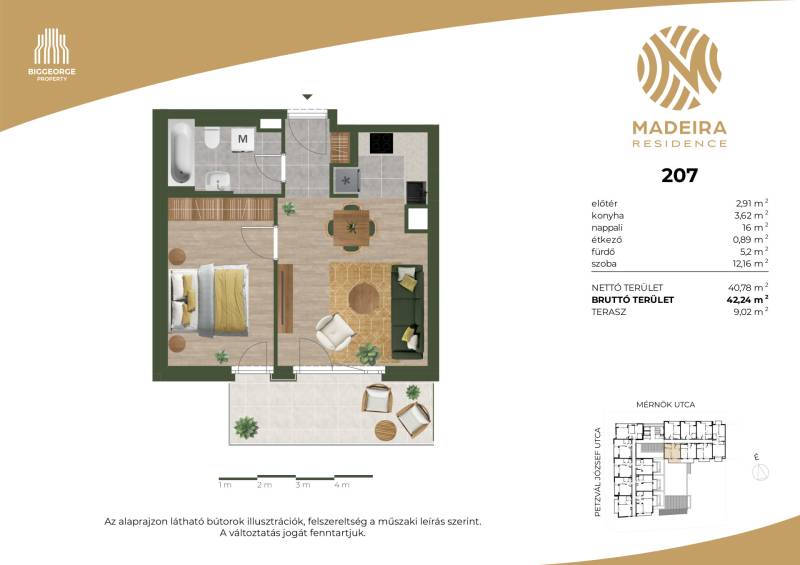 Projekt bemutatásaA projektrőlKépzeld el, ahogy belépsz Újbuda egyik legbékésebb, zöldövezeti utcájába, ahol a nyugalom átveszi a helyét a város zajos ritmusától. A Mérnök utcában, a Fehérvári út és az Etele út találkozásának közelében, egy elegánsan modern épület rajzolódik ki előtted – ez a Madeira Residence.Ahogy közelebb lépsz, a homlokzat letisztultsága, a loggiák ritmikus váltakozása azonnal megragadja a tekinteted. A pálcás korlátok finom eleganciát sugároznak, a napfény pedig játékosan tükröződik a teraszok üvegfelületein. Már kívülről is érezni: ez nem csupán egy lakóépület, hanem egy életérzés.Az első emeleti lakások egy része saját tetőkerttel rendelkezik – képzeld el, ahogy reggel a kávédat kortyolgatod a saját kis zöld oázisodban, miközben a madarak csicsergése tölti be a teret. Minden lakásban ott a tágas nappali, a kényelmes hálószobák, és a saját erkély vagy terasz, ahol a nap bármely szakában megpihenhetsz.A Madeira Residence nem csupán egy új építésű társasház – ez egy hely, ahol a modern életstílus találkozik a természet közelségével és a családbarát környezettel. Egy otthon, ahol minden nap élmény.A belső térben a kényelem és a fenntarthatóság kéz a kézben jár. A mennyezeti hűtés-fűtés rendszer csendesen gondoskodik a kellemes hőmérsékletről, az okosotthon-előkészítés pedig lehetővé teszi, hogy a technológia valóban a kényelmedet szolgálja. A mélygarázsban kényelmes parkolás vár, a kerékpártárolók és az elektromos autótöltési lehetőség pedig a környezettudatos életmódot támogatják.A környék infrastruktúrája kiváló: a közelben kiépített kerékpárutak, car sharing szolgáltatások és elektromos rollerek teszik egyszerűvé és fenntarthatóvá a közlekedést. A családosok számára külön öröm, hogy több játszótér is található a közelben – a gyerekek biztonságban, szabadon játszhatnak, miközben a szülők nyugodtan élvezhetik a környék nyugalmát.A Madeira Residence nem csupán egy új lakóépület – ez egy életérzés, ahol a mindennapok élménnyé válnak.