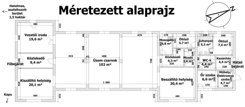 Recsken a község szélén 226nm-es ipari üzem, 15.000nm-es telken eladó. 1 km-re a 24-es főúttól.Recsk külterületének déli részén eladó jó állapotú ipari épület, hatalmas, nagyrészt aszfaltozott telken.Kizárólag az Otthon Centrum kínálatában!Az ingatlanhoz készült egy bemutatóvideó, a teljes ingatlant bemutatom rajta, megtekinthető az Otthon Centrum weboldalán.Az ingatlan 15.000 nm-es, azaz 1,5 hektáros teleken helyezkedik el, kiváló állapotú, nagy teherbírású útról közelíthető meg.Az épület téglából épült kb. a 2000-es években.Közművek víz, gáz, villany (3 fázisú ipari áram) bekötve, a szennyvíz derítőbe gyűlik.Az épület fűtéséről gáz-cirkó kazán is gondoskodik radiátorokon keresztül.Az ingatlan jelenleg nincs használva, üres, kulcsok nálam vannak, rugalmasan be tudom mutatni, de kérem, előbb nézze meg a bemutató videót.Az alaprajz és a 3D-s rajz is cm-re pontosan készült, ezeket a komoly érdeklődők rendelkezésére bocsátom a megtekintés után, hasznos lehet a tervezés és a berendezés során.Ha a hirdetés felkeltette az érdeklődését, vagy kérdése van, kérem hívjon a megadott telefonszámomon.Ingatlanirodánk teljeskörűen segíti az ingatlanok adásvételét, ügyvéd, bankfüggetlen hitelügyintéző, energetikus és a lelkes ingatlanközvetítő is rendelkezésére áll akár hétvégén, vagy ünnepnapokon is ;-)