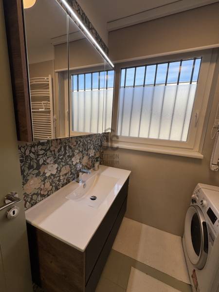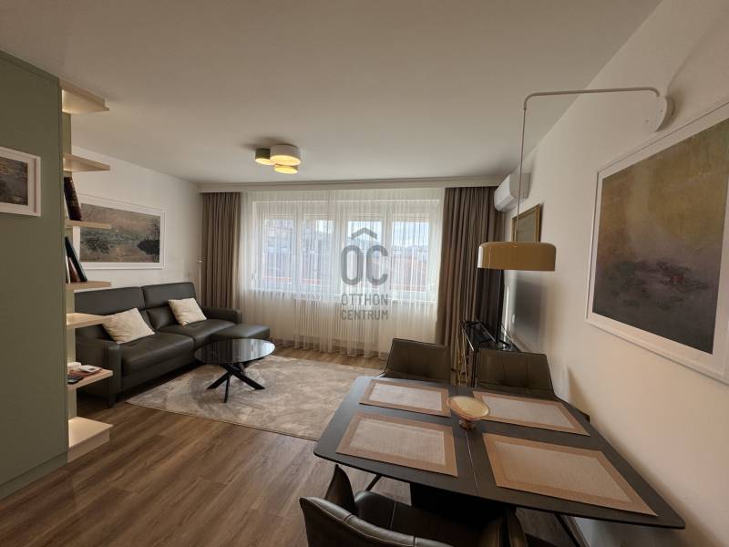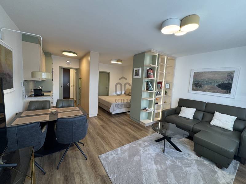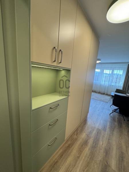 Képzeld el, hogy valaki jobbat tervezett mint amit kitalálnál. Minden új, minden szép és minden készen van. Csak arra vár, hogy birtokba vedd. Tévedsz ha azt gondolod, hogy eladásra készült, akkor nem költöttek volna rá ennyit. Da van olyan, hogy az élet másként alakul,és ez teremti a különleges lehetőségeket.Lehet hogy Te leszel az, akinek 40 m2-en is van elegendő tárolóhelye? Akinek egyedi tervek alapján készült bútorai lesznek? Aki érzi hogy az egész lakását körülöleli az ergonómia,a színek harmóniája és a kényelem. Ahová jó megérkezni , de ha elmész otthonról, akkor is minden közel van. A Dunapart, a bevásárlás, a közlekedés, vagy a szórakozás. És mindezt egy liftes, rendezett ház 7. emeletén találod, ahol a magasság csendet, fényt és egy kis plusz panorámát is jelent. A lakás így nemcsak komfortos, hanem kimondottan kellemes hangulatú .Az előszobába lépve hatalmas tükrös gardrob fogad, ami nemcsak befogad minden kabátot és cipőt, hanem tágas térérzetet ad mindjárt a megérkezéskor. Balra a mosdó aminek hangulatos design csempéje üde színeket ad a helyiségnek. Szemben tovább haladva a gépesített konyhába érkezünk , amely az egész lakás egyedileg gyártott bútoraihoz hasonlóan törtfehér és finom zöld színekben lett kialakítva. A lakás tulajdonképpen egyterű, de a belsőépítész által tervezett bútorok körbehatárolják a konyhát, illetve egy hálószobát, ahol a hatalmas, 180 cm széles kényelmes ágy kapott helyet. A hálóból nyílik a zuhanyzós és ablakos fürdőszoba , ahol mosó-szárítógép is helyet kapott, melynek segítségével nem kell a lakásban ruhaszárítót kerülgetni. Aki már lakott kis lakásban, tudja milyen fontos ez. A nappaliban kényelmes kanapé, led világításos könyvespolc, melynek hátsó oldala a háló gardróbja , és kényelmes méretű étkezőasztal kapott helyet. A lakás klimatizált.A közös költség mindössze 28.000 Ft, amely magában foglalja a fűtést, valamint a hideg- és melegvíz-fogyasztást is. A vételár a teljes berendezést , és a háztartási gépeket is tartalmazza.Ha a belvárosba költöznél, vagy csak kell egy hely a belvárosban is, amivel nincs gond, ami mindenben a kényelmedre törekszik és ahová tényleg csak a bőröndödet kell hozni,hívj és nézzük meg együtt!