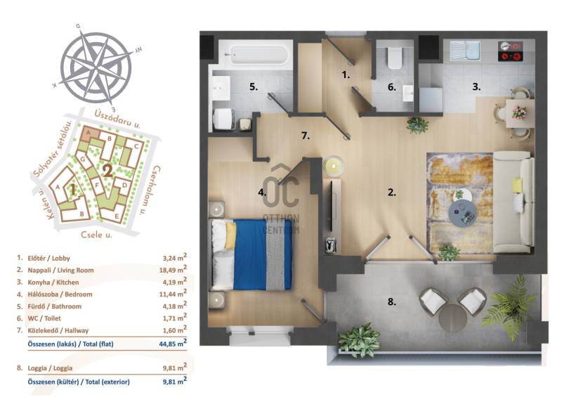 A XIII. kerület legnépszerűbb lakónegyedében, a Marina parton, a Duna Terasz Grande második épületében keresi új tulajdonosát egy amerikai konyhás nappali + hálószobás, 9,81 m2-es loggia-val rendelkező napfényes lakás! Ha érdekes lehet Önnek a Foka öböl közelében található, a modern életstílust az otthonos, családias hangulattal ötvöző ingatlan, akár befektetési célból akár saját célra, akkor ezt feltétlenül nézze meg!MIÉRT IDEÁLIS A LAKÁS?- 1. emeleti, 44,85 m2-es, 2 szobás, 9,81 m2-es loggia-val rendelkező ingatlan.- Felosztása: előtér, amerikai konyhás nappali és étkező, hálószoba, fürdőszoba, WC, erkély.- Kialakítása modern, elosztása logikus, a szobák tájolása nyugati.- A nappaliból és a hálószobából is van kijárat a nagy sarok erkélyre.- Magas minőségű és esztétikus anyagokkal, igényes burkolatokkal, prémium Laufen szaniterekkel, Hansgrohe csaptelepekkel készült.- A szobákat és az előteret laminált padlóval a fürdőszobát járólappal burkolták.- Nyílászáról műanyagok, ablakai hő és hangszigetelt 3 rétegű üveggel szereltek, az élettér világos.- Hőszivattyú által működtetett hálózat biztosítja, hogy a mennyezeti hűtés-fűtés, a legkevesebb energiafelhasználással az optimális hőfokot érje el.- Energetikai besorolása A++- A lakás egyedi hőmennyiség mérővel, vízórával, illetve elektromos mérőórával felszerelt.- A tervezett fűtési és hűtési költség (45 m2-es lakás esetén) kb. 10.000,-Ft/hó.- A lakásban okosotthon rendszer, videós kaputelefon és elektromos redőny előkészítés is van.- Az ingatlan könnyen kiadható, átlagosnál magasabb megtérülést biztosíthat.- A lakáshoz + 8,5 millió Ft-ért vásárolható egy normál méretű teremgarázs beálló hely.- A vételár tartalmazza az egyedileg készített konyhabútort háztartási gépekkel felszerelve, illetve a LED-es lámpatesteket minden helyiségben.AMIT A HÁZRÓL TUDNI KELL:- 2024-ben átadott, 5-9 szintes, 790 lakásos, tudatosan tervezett, letisztult épület.- A lakópark a modern városi élethez igazodó építészeti stílust képviselve kínál magas minőséget.- A társasház vasbeton monolit szerkezetű, 30 cm-es Porotherm téglából álló külső kitöltő falakkal és 15 cm-es dryvit szigeteléssel.- A lakásokat 30 cm-es Szilka tégla fal választja el.- A homlokzat és a lépcsőház modern vonalvezetésű, igényes megjelenésű.- A pinceszinten és a földszinten teremgarázs beállók és tárolók, valami modern liftek biztosítják a lakók kényelmét.- Műszaki tartalma magas minőségű, innovatív megoldásokkal és zöld energia felhasználással készült.- A társasház belső részén több kisebb parkosított, zöld belső kert került kialakításra.- A társasházban 0-24 Portaszolgálat és csomagpont is működik.KÖRNYÉK ÉS KÖZLEKEDÉS:- XIII. kerület, Vizafogó városrész, Marina part, Úszódaru utca.- Kiváló infrastruktúrával és tömegközlekedéssel rendelkező, folyamatosan fejlődő terület, természetközeli környezet.- A Gyöngyös utcai M3-as metrómegálló és a Duna Plaza, 5 perc sétatávolságra van.- A 15-ös busz megállója 50 m távolságra van, a 950-es és a 950A éjszakai buszjáratok 20 percenként közlekednek.- 500 méteren belül gyalogosan elérhető minden, ami a hétköznapokhoz szükséges.- Karnyújtásnyira van gyógyszertár, orvosi rendelő, edzőtermek, mozi, éttermek és szolgáltatók sokszínű választéka.- A lakóparkban közös jóga, napozó és grillterasz, játszótér, kültéri edzőterem lett kialakítva.- A közelben van hajókikötő, Duna parti sétány, kerékpárút, a Dagály fürdő, és az Aréna uszoda.- A nagyobb budapesti egyetemek tömegközlekedéssel maximum 15 perc alatt elérhetők.- Az autóval közlekedők a Váci úton érhetik el Buda és Pest főbb csomópontjait, valamint az M0-ás és M2-es autópályákat.- A környék kifejezetten vonzó a fiatalok és a kozmopolita életet kedvelők számára.FINANSZÍROZÁSBAN – ONLINE IS – SEGÍTÜNK!- Bankfüggetlen hitelcenterünk díjmentesen versenyezteti az összes bank és hitelintézet ajánlatát.- Önnek csak annyi a dolga, hogy egyeztet munkatársunkkal, majd kiválasztja a hosszú távon is legkedvezőbb konstrukciót.- Szakértőink 20 év tapasztalattal, fogyasztóbarát lakáshitelekkel, babaváró hitellel és teljes körű CSOK Plusz és OTTHON START program ügyintézéssel várják.- Időpont-egyeztetéssel munkaidő után is elérhetők.Ha valóban igényes és minőségi felújításon átesett, különleges lakást keres, jöjjön és nézzük meg együtt! EGYEDI LEHETŐSÉG, ne maradjon le róla!Érdeklődés esetén VÁROM HÍVÁSÁT a hét minden napján!