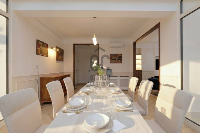 Penthouse a Szent István park felett – Margitsziget-panoráma, 50 m²-es tetőterasz, luxus Újlipótváros szívébenA 110 m²-es, belsőépítész által megálmodott otthon a kifinomult dizájn és a mindennapi kényelem kiegyensúlyozott elegyét kínálja. A lakás szíve az üvegfalú télikert-étkező, ahol télen-nyáron természetes fényben élvezheti a Dunára és a budai hegyekre nyíló kilátást.A tágas belső terek mellett hatalmas privát tetőterasz várja kültéri zuhannyal – ideális hely a város feletti pihenéshez. A lakásban 2 hálószoba, 2 fürdőszoba és egy nagy méretű nappali található, és válogatott prémium bútorokkal berendezett és gépesített. (A bútorok egy része a fotókon még nem látható.)– 110m² lakótér klimatizált üvegfalú télikert-étkezővel, 50m²-es tetőterasszal– Elsőrangú lokáció Újlipótvárosban a Pozsonyi út és a Szent István park mellett – Villamos: 4/6, trolibusz:75, 76, nem messze M3-as Metró, Nyugati Pu.-tol.– Örök panoráma a Szent István Parkra, a Margitszigetre és a budai hegyekre– Lifttel megközelíthető csendes legfelső szint - kerekesszékes használatra alkalmas– Prémium gépesítés, okostévé, okostelefonról vezérelhető klimatizálás és világítás– Távfelügyeletbe kötött riasztó, korszerű nyitás- és füstérzékelés– Parkolás közeli garázsban (bérlet része)– Otthonmenedzsment-asszisztencia (pl. tetőterasz ápolása) a bérlet része – takarítás igény szerintEz az ingatlan több mint lakás – életforma azoknak, akiknek fontos a tetőterasz és a télikert nyújtotta hangulat és a dunai horizont zavartalan látványa.Bérleti feltételekSzerződéskötéskor 2 havi kaució és 1 havi bérleti díj fizetendő.Minimum bérleti idő: 2026 július 31-igNemdohányzó ingatlan; szabadon mozgó kisállat nem hozhatóKözjegyzői okiratba foglalt kiköltözési nyilatkozatFelhívjuk figyelmét, hogy a képgaléria a lakás bútorozás előtti és utáni, berendezett állapotát is bemutatja, így a felvételek között eltérések tapasztalhatóak.