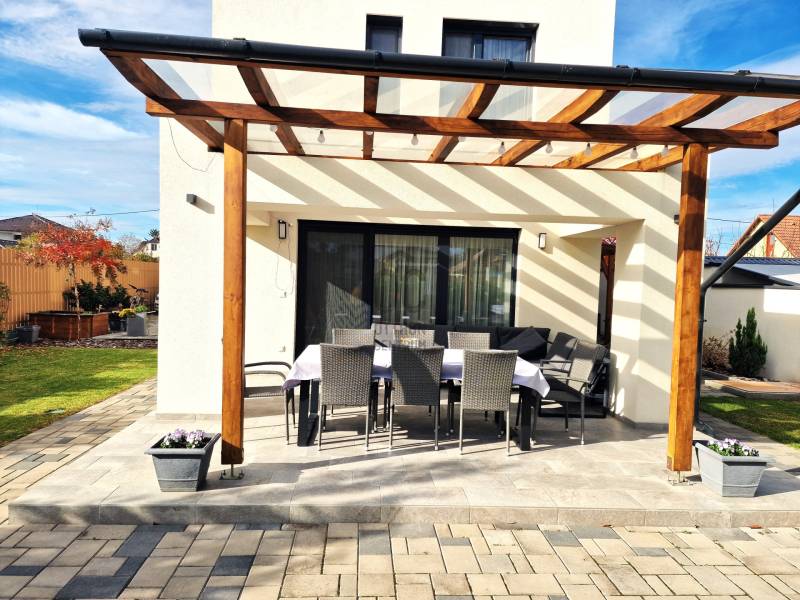 Debrecen csendes, de mégis központi elhelyezkedésű, felkapott városrészében, a Csigekertben várja új lakóit ez a gyönyörű, prémium kivitelezésű 2021-ben épült ház. A családosok számára ideális otthon, amely nemcsak tágas nappalijával és amerikai konyhájával, hanem egyedi tervezésével és modern megoldásaival is lenyűgöz. A konyhában található konyhasziget tökéletes helyszínt biztosít a családi összejövetelekhez, míg a világos terek és a beépített bútorok és szekrények maximális kényelmet nyújtanak. A házban található LED hangulatvilágítás és motoros redőnyök nemcsak a modern életstílust tükrözik, hanem a komfortérzetet is növelik. Az integrált szúnyoghálók lehetővé teszik, hogy a nyári estéket zavartalanul élvezhesse a kertben, ahol egy rendezett kert és egy jakuzzi található, ideális a pihenéshez és a kikapcsolódáshoz. Az automata öntözőrendszer gondoskodik arról, hogy a kert mindig szép és ápolt legyen, míg a biztonsági ajtó és a riasztórendszer garantálja a családja biztonságát. A környék ellátottsága kiváló, a közeli boltok, iskolák és óvodák minden szükséges szolgáltatást biztosítanak. A csendes utcákban való séták és a gyerekek biztonságos játékának lehetősége még vonzóbbá teszi ezt a helyet. A közlekedési lehetőségek szintén kedvezőek: a város tömegközlekedési hálózata gyors és kényelmes eljutást biztosít Debrecen belvárosába, valamint a környező településekre is. Ez a kertkapcsolatos lakás nem csupán egy ingatlan, hanem egy igazi otthon, ahol a család minden tagja megtalálhatja a számításait. Az okos otthon rendszer lehetővé teszi, hogy az ingatlan minden funkcióját távolról irányítsa, így a modern technológia és a kényelem tökéletes harmóniáját élvezheti. Amennyiben érdeklik a részletek, vagy kérdései lennének az ingatlannal kapcsolatban, bizalommal keressen fel minket! Az ingatlan megtekintése során szívesen válaszolunk minden felmerülő kérdésére, hogy Ön is megtalálja álmai otthonát.