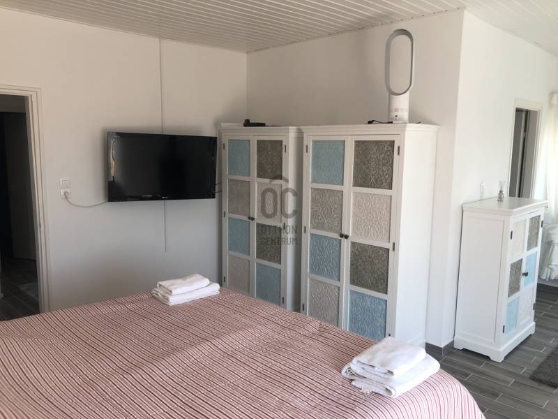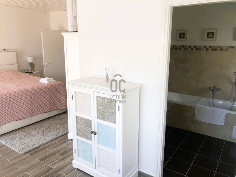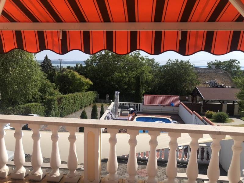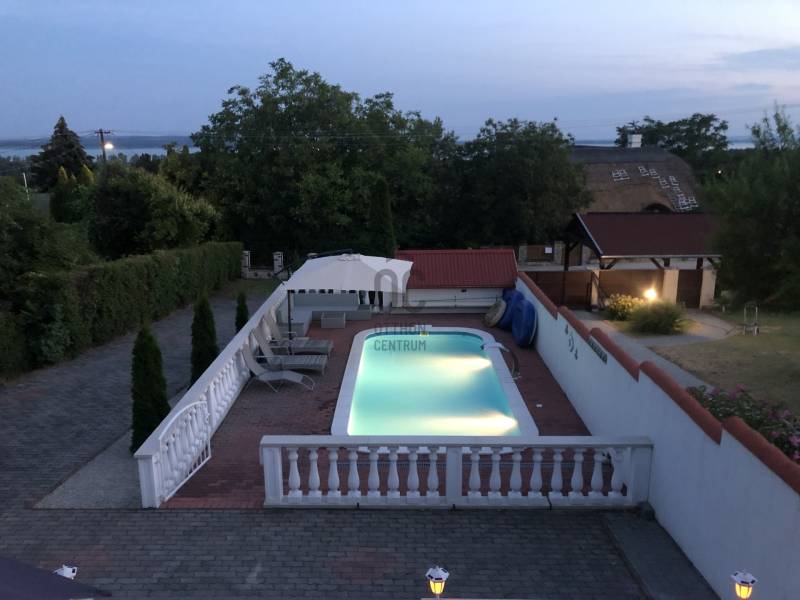 A BALATON ÉSZAKI PARTJÁN, VONYARCVASHEGYEN CSENDES KÖRNYÉKEN, NYUGODT KÖRNYEZETBEN ELADÓ PANORÁMÁS, TÖBB FUNKCIÓS CSALÁDI HÁZ ÚSZÓMEDENCÉVEL. AZ OTTHON CENTRUM KIEMELT AJÁNLATA.Az ingatlant biztonságos, kedvelt kicsi zsákutcában találjuk. Pontosan illik rá a település szlogenje: \" Mögöttünk az erdő, előttünk a víz.\" A telek 714 m2, nagyrész térkövezett, könnyen karbantartható. A ház két szintes, hatalmas terasszal, erkéllyel, ahonnan a Balaton tükrében is gyönyörködhetünk. Megbízható minőségben épült 2003-ban, néhány éve modernizálták, alakítottak a használati beosztáson.További jellemzői: - Összközműves tégla épület, cserép fedéssel. Műanyag nyílászárók. - Gáz cirkó fűtés, + két hangulatos kandalló -4 hálószoba, 3 fürdőszoba nagyobb családnak is kényelmes elhelyezést biztosít. - A nettó lakótér 120 m2, ami nem foglalja magában a teraszokat, erkélyt, tárolókat. - Helyiségek: A földszinten teraszkapcsolatos nappali, egy légterű, de szaperált modern konyhával, étkezővel. Kis közlekedőből nyílik egy fürdő, tágas hálószoba és a lépcsőfeljáró. A felső szintre belül, és külső lépcsön is fel lehet jutni. Itt három hálószobát, zuhanyzós és kádas fürdőszobaát alakítottak ki. A déli tájolású legnagyobb hálóból panoráma erkély nyílik. ( Az alaprajzon a megnevezésekben változás történt)A ház mögött két méretes tároló, elektromos távirányítós záróredőnyökkel. Elektromosan vezérelt kapu. Mivel a két szint külön bejárattal is rendelkezik, két generáció lakhatására, nyaralására, kiadásra is alkalmassá tehető. Befektetésnek szintén kiváló ajánlat.A ház teljes berendezéssel. felszereléssel kerül értékesítésre, amit a vételár tartalmaz. Vonyarcvashegyet a Keszthelyi-hegység öleli körül, erdőivel, szőlőültetvényeivel, árnyas pincéivel, benne sajátos ízvilágú boraival. Ötcsillagos Lido strandja számos alkalommal érte el a Balaton legszebb, legsportosabb strandja kitüntető elismerést. A környék jellegzetessége a Csándor-hegy tetején álló Kálvária út és a végén a 2010-ben felszentelt 7,38 méter magas Fénykereszt. A Balatonból kiemelkedő egykori dombsziget, a 136 méter magas Szent Mihály domb. Tetején áll a 40 jéghalász megmenekülése emlékét őrző Szent Mihály Fogadalmi Halászkápolna, mely Magyarország, sőt a tengerparttal nem rendelkező országok egyetlen Halászkápolnája. Ez a csodás fekvésű, romantikus hangulatú szakrális hely megigézi az idelátogatókat. A hosszú évszázadok múltját őrző kápolna Vonyarcvashegy jelképévé vált.Ha felkeltette érdeklődését a fenti ingatlan, további kérdései vannak, megtekintéshez időpontot egyeztetne, kérem, hívjon, írjon a megadott elérhetőségeken.