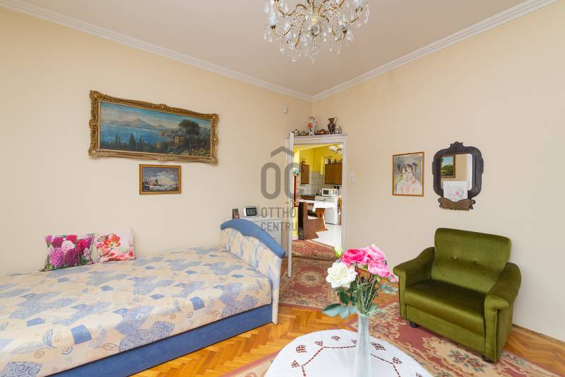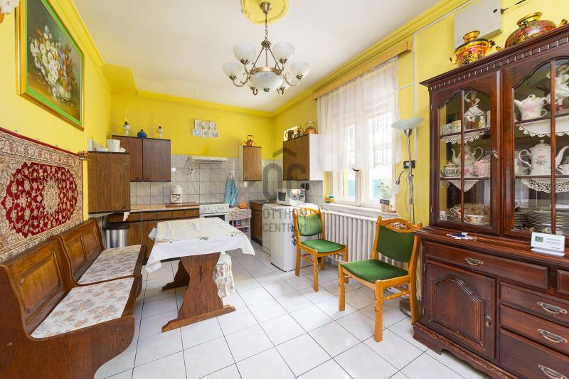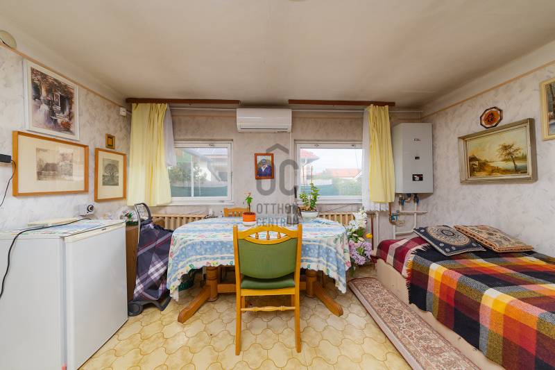 XVIII. kerületben a Béke tér környékén csendes mellékutcában, de kiváló közlekedéssel kínálunk megvásárlásra egy földszintes kialakítású ikerház felet. Klasszikus ikerház, a telek középen kerítéssel elválasztva, önálló utcai bejárat mindkét ikerfél lakói számára. A ház tégla építésű, cserép fedéses, belső elosztása tágas és kényelmes. A fedett teraszról nyílik a bejárat, egy jó méretű előszobából jutunk be a nagy méretű konyha-étkezőbe, innen két déli tájolású, világos szobát találunk, továbbá egy jó állapotú fürdőszoba, egy külön mellékhelyiség és egy belső lépcsőház is helyet kapott, innen közvetlenül juthatunk le a szuterén szinten lévő nagy garázsba. A házban kialakításra került még két szoba. A fűtést gázcirkó biztosítja, nyáron a kellemes hőmérsékletről két klíma gondoskodik. A telek 303 nm, a csatorna bekötése folyamatban van, február végére készen lesz. Telken belül több autóval is parkolhatunk, a garázsban további egy (kisebb) autó elfér, illetve van hely tárolásra is. A ház mögött egy kerti tároló is kialakításra került szerszámoknak, sporteszközöknek. Az utcai kapu elektromos. Csendes, családi házas mellékutca, a közelben (6 perc séta) több buszmegálló is megtalálható: 166, 236, 266, vonatállomás 5 perc séta, iskola, bevásárlási lehetőség, posta 5-10 percen belül gyalogosan elérhetők. Az ingatlan jogi háttere rendezett, rövid időn belül birtokba vehető.