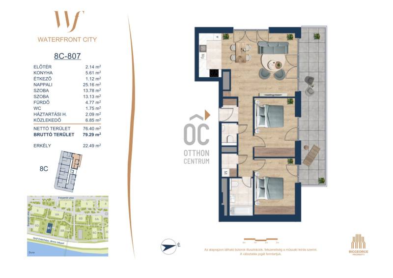 Projekt bemutatásaA projektrőlA Waterfront City egy új, modern városnegyed a 3. kerületben, ahol a természet közelsége és a városi kényelem tökéletes egyensúlyban van. A Duna-part közvetlen szomszédságában elhelyezkedő fejlesztés különleges atmoszférát kínál: a sétányt új épületek határolják, üzletekkel, kávézókkal és szolgáltatásokkal, amelyek élhető közösségi teret teremtenek.A 13 emeletes lakóépületből lenyűgöző örökpanoráma nyílik a budai hegyekre és a folyóra, a tágas teraszok pedig ideálisak a pihenéshez vagy a baráti összejövetelekhez. A zöldtetők, parkosított terek és fenntartható megoldások – mint az energiatakarékos rendszerek és okos otthon funkciók – mind hozzájárulnak a modern, környezettudatos életstílushoz.Látogass el értékesítési irodánkba, és tekintsd meg a városnegyed makettjét személyesen! Ismerd meg, milyen lesz az élet Budapest egyik legizgalmasabb új fejlesztésében!Óbuda szívébenKépzeld el, ahogy egy napsütéses délelőttön Óbuda szívében sétálsz, a Duna közelsége frissítően hat rád, miközben a Folyamőr utca, a Miklós tér és a Bogdáni út által határolt, öt hektáros területre érsz. A levegőben ott van a város történelme, mégis minden részletében a jövő hívogat.A 50 000 négyzetméteres területen egy hangulatos sétány vezet végig, amely egyenesen az óbudai Fő térre visz – mindössze 600 méterre. Ez a sétány nem csupán összeköt, hanem élményt nyújt: a Kolosy térről induló Óbudai Promenád részeként a város egyik legélhetőbb, legpezsgőbb szakaszán haladsz végig. És ha biciklivel érkeznél? A nemzetközi kerékpárút is itt halad el, Szentendre felé vezetve.Az 5. ütemben épülő 149 lakás mindegyike egyedi hangulatot kínál. Ahogy belépsz egy-egy otthonba, a hatalmas üvegfelületeken át beáradó fény és a tágas, szellős terek azonnal magukkal ragadnak. A kilátás? A Kaszap István park zöldje nyújt békét, míg a felsőbb emeletekről a Budai-hegység örökpanorámája tárul eléd – minden nap egy új festmény az ablakodban.A 6. ütemben 316 modern lakás épül, tágas teraszokkal és lenyűgöző kilátással a Dunára és a budai hegyekre. A lakók kényelmét őrszolgálat, kamerarendszer, mélygarázs, vendéglátóhelyek, belső park, játszótér és E-autó töltők szolgálják. Ez a projekt utolsó üteme, amely még közvetlen Duna-parti kapcsolattal rendelkezik.