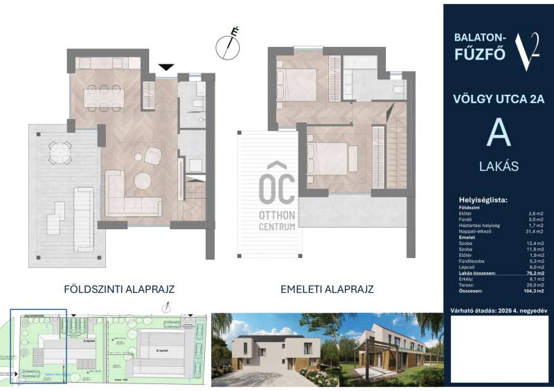 (2026-IV.) V2AB ikerház fél: 76,2 m² lakótér + 28 m² erkély és terasz, saját kerttel, 119,9 MFt,250 m a Fövenyfürdő strandtól és a kikötőtől,5 lakás épül - kis lakásszámú fejlesztés - két épületben, ebből még 3 lakás elérhető.Földszinti elosztás – jól átgondolt terekkel:-előtér gardróbhellyel (2,6 m²) és belső, privát lépcső (5,4 m²),-tágas, egy légterű nappali–konyha–étkező (40,0 m²) közvetlen (20,0 m²) teraszkapcsolattal, amely délnyugati erkélyre/teraszra nyílik, kiváló helyszín családi vacsorákhoz, napozáshoz, baráti összejövetelekhez.-háztartási helyiség (1,7 m²), -külön fürdőszoba (3,2 m²).Emeleti elosztás – jól átgondolt terekkel:-3 kényelmes hálószoba (12,3 m² és 9,2 m² és 9,5 m²),-külön fürdőszoba (5,3 m²),-előtér (4,0 m²),-WC (2,0 m²),-erkély: (5,4 m²).Parkolóhely:-udvari beállóhely: (2db) külön megvásárolható (3,0 Mft.)Műszaki tartalom – alacsony rezsi, magas komfort:„A” energetikai besorolású, hőszivattyús rendszerrel,Felület fűtés–hűtés minden helyiségben,Választható, minőségi burkolatok és szaniterek,Téglafalak kívül-belül, korszerű, szigetelt nyílászárók, nappaliban emelő-toló ajtó,Szigetelt falazat és tető, elektromos redőny előkészítéssel,A műszaki megoldások hosszú távon kiszámítható, energiahatékony fenntartást biztosítanak, így a lakás kiváló választás állandó otthonnak.Finanszírozás, környezet, parkolás:A lakás CSOK igénybevételére alkalmas,Kedvező finanszírozási konstrukciókkal megvásárolható, Balatonfűzfő teljes infrastruktúrával rendelkező, élhető város kevesebb mint 1 órára Budapesttől, Környezetében boltokkal, éttermekkel, vasútállomással rövid sétatávolságon belüli partszakasszal,A telken belül gépkocsi-beálló vásárolható.Elérhető lakások a fejlesztésben:V2BC (ez a lakás): 72,9 m² lakótér + 17,9 m² délnyugati terasz, emeleti lakás, 99,5 MFt,V2AB ikerház fél: 76,2 m² lakótér + 28 m² erkély és terasz, saját kerttel, 119,9 MFt,V2AA ikerház fél: 93,0 m² lakótér + 25 m² erkély és terasz, saját kerttel, 129,9 MFt.Akiknek ajánljuk:Az ingatlan ideális választás mindazoknak, akik a Balaton partján keresnek modern, napfényes, jól kihasználható terekkel rendelkező otthont – akár életvitelszerűen, akár nyaralóként vagy befektetésként.Projekt bemutatásaElérhető lakások a fejlesztésben:V2BC (ez a lakás): 72,9 m² lakótér + 17,9 m² délnyugati terasz, emeleti lakás, 99,5 MFt,V2AB ikerház fél: 76,2 m² lakótér + 28 m² erkély és terasz, saját kerttel, 119,9 MFt,V2AA ikerház fél: 93,0 m² lakótér + 25 m² erkély és terasz, saját kerttel, 129,9 MFt.250 m a Fövenyfürdő strandtól és a kikötőtől,5 lakás épül - kis lakásszámú fejlesztés - két épületben, ebből még 3 lakás elérhető.Parkolóhely:-udvari beállóhely: (1db) külön megvásárolható (1,5Mft.)-udvari beállóhely: (2db) külön megvásárolható (3,0Mft.)-udvari beállóhely: (1db) külön megvásárolható (1,5Mft.)Műszaki tartalom – alacsony rezsi, magas komfort:„A” energetikai besorolású, hőszivattyús rendszerrel,Felület fűtés–hűtés minden helyiségben,Választható, minőségi burkolatok és szaniterek,Téglafalak kívül-belül, korszerű, szigetelt nyílászárók, nappaliban emelő-toló ajtó,Szigetelt falazat és tető, elektromos redőny előkészítéssel,A műszaki megoldások hosszú távon kiszámítható, energiahatékony fenntartást biztosítanak, így a lakás kiváló választás állandó otthonnak is.Finanszírozás, környezet, parkolás:A lakás 3%-os Otthonfelújítási Hitel (Otthon Start) és CSOK igénybevételére alkalmas,Kedvező finanszírozási konstrukciókkal megvásárolható, Balatonfűzfő teljes infrastruktúrával rendelkező, élhető város kevesebb mint 1 órára Budapesttől, Környezetében boltokkal, éttermekkel, vasútállomással rövid sétatávolságon belüli partszakasszal,A telken belül gépkocsi-beálló vásárolható.Akiknek ajánljuk:Az ingatlan ideális választás mindazoknak, akik a Balaton partján keresnek modern, napfényes, jól kihasználható terekkel rendelkező otthont – akár életvitelszerűen, akár nyaralóként vagy befektetésként.