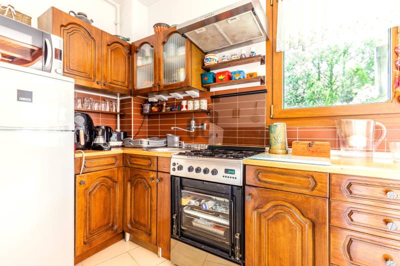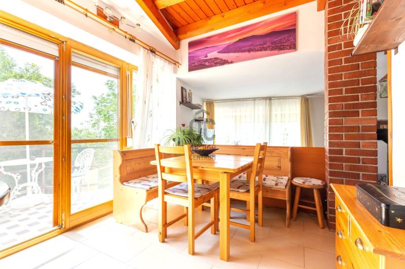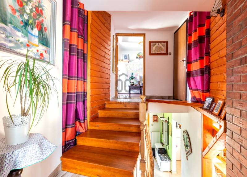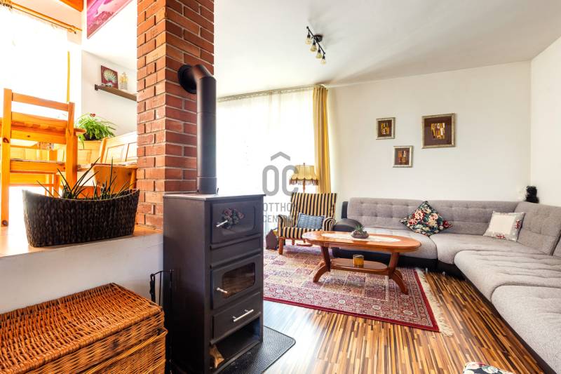 Eladó Szentendre Petyinán, aszfaltozott, örök panorámás, csendes zsákutcában 420 m2 telken, egy egyedi tervek alapján épült 80 nm-es, 10 nm pincei tárolóval, két, összesen 23,5 nm terasszal rendelkező 1+3 (jelenleg 2+1) szobás, 1990-ben épült jó állapotú családi ház. Az épület felújított, korszerűsített, és jól karban tartott. Redőnnyel és szúnyoghálóval is rendelkező nyílászárói termó üvegezésűek, falai szigeteltek, fűtését kondenzációs gáz cirkó biztosítja, de a nappaliban esztétikus és hangulatos kis kályha és hűtő fűtő klímaberendezés is rendelkezésre áll. Beosztását a földszinten előszoba, konyha, étkező, fürdőszoba és tágas nappali, a tetőtérben egy külön wc, két gardrób, és két szoba alkotja, mely szobák egyike eredetileg két félszobát alkotott, a visszaalakítás egyszerűen megoldható. Az egyedi tervezés a tereket apró szinteltolásokkal, valamint a nappaliból és az étkezőből is megközelíthető, összesen 23,5 nm-es terasszal gazdagította. A gondozott kertel rendelkező telken az elektromos kapun át bejutva két autó számára beállóhelyet, a terasz alatti terület beépítésének köszönhetően egy 4, a pincében pedíg egy 6,5 nm-es tárolót is találunk. Fontos, hogy az ingatlan, a Csok-nál kritériumként előírt redukált alapterületi minimum nm-t nem éri el, de otthon startnak megfelel. Ha felkeltettem érdeklődését, várom hívását!