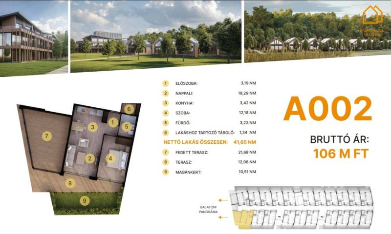 Balatonföldvár: Balatonföldvár fontos turisztikai célpont, nemcsak a magyarok, hanem más európai országok turistái számára is, természeti szépségei (például a löszhegy és a nagy virágos parkok), továbbá történelmi örökségei (például a kelta ösvény, a régi kúriák és villák) miatt számtalan szabadidős lehetőséget, valamint számos vízi sportot (vitorlázás, szörfözés, horgászat, evezés)Balaton liget willapark:Lakások száma: 56 db.Alapterület: 28-56 m².A földszinti lakásokhoz saját, privát kert tartozik.A földszinten 21 lakás található, 48–110 m² közötti alapterülettel.Az első emeleten további 21 lakás érhető el, 47–75 m² közötti méretben.A második emeleten 17 lakás kapott helyet.A lakásokhoz önálló tárolóhelyiségek tartoznak, amelyek a közös folyosóról közelíthetők meg.Környezettudatos építő anyagokA+ energetikai besorolásFelszíni parkoló: 6.350.000. Ft.Modern letisztult építészet, tömegformálás, Balatonra tájolt panorámás teraszok.Apartmanlakás - alapfelszereltség:100% tömör CLT Ausztriából.20 cm kőzetgyapot hőszigetelés.Fa hőszigetelő nyílászárók 3 rétegű üvegezéssel,tölgyfurnér melegburkolat.Porcelán greslap hidegburkolat, villeroy fürdőszoba szaniterekpadlófűtés.Levegős hőszivattyú (VRV splitklíma), 50kW társasházi napelemrendszer, elektromos redőny, szúnyogháló beépített bútoroksaját terasz.A002. lakás.A további kérdésekkel és a megtekintéssel kapcsolatban kérem keressen a megadott mobil számon.