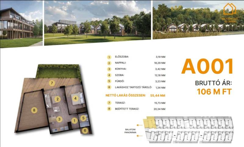 Balatonföldvár: Balatonföldvár fontos turisztikai célpont, nemcsak a magyarok, hanem más európai országok turistái számára is, természeti szépségei (például a löszhegy és a nagy virágos parkok), továbbá történelmi örökségei (például a kelta ösvény, a régi kúriák és villák) miatt számtalan szabadidős lehetőséget, valamint számos vízi sportot (vitorlázás, szörfözés, horgászat, evezés)Balaton liget willapark:Lakások száma: 56 db.Alapterület: 28-56 m².A földszinti lakásokhoz saját, privát kert tartozik.A földszinten 21 lakás található, 48–110 m² közötti alapterülettel.Az első emeleten további 21 lakás érhető el, 47–75 m² közötti méretben.A második emeleten 17 lakás kapott helyet.A lakásokhoz önálló tárolóhelyiségek tartoznak, amelyek a közös folyosóról közelíthetők meg.Környezettudatos építő anyagokA+ energetikai besorolásFelszíni parkoló: 6.350.000. Ft.Modern letisztult építészet, tömegformálás, Balatonra tájolt panorámás teraszok.A001. lakás.A további kérdésekkel és a megtekintéssel kapcsolatban kérem keressen a megadott mobil számon.