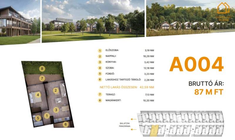 Balatonföldvár: Balatonföldvár fontos turisztikai célpont, nemcsak a magyarok, hanem más európai országok turistái számára is, természeti szépségei (például a löszhegy és a nagy virágos parkok), továbbá történelmi örökségei (például a kelta ösvény, a régi kúriák és villák) miatt számtalan szabadidős lehetőséget, valamint számos vízi sportot (vitorlázás, szörfözés, horgászat, evezés)Balaton liget willapark:Lakások száma: 56 db.Alapterület: 28-56 m².A földszinti lakásokhoz saját, privát kert tartozik.A földszinten 21 lakás található, 48–110 m² közötti alapterülettel.Az első emeleten további 21 lakás érhető el, 47–75 m² közötti méretben.A második emeleten 17 lakás kapott helyet.A lakásokhoz önálló tárolóhelyiségek tartoznak, amelyek a közös folyosóról közelíthetők meg.Környezettudatos építő anyagokA+ energetikai besorolásFelszíni parkoló: 6.350.000. Ft.Modern letisztult építészet, tömegformálás, Balatonra tájolt panorámás teraszok.Apartmanlakás - alapfelszereltség:100% tömör CLT Ausztriából.20 cm kőzetgyapot hőszigetelés.Fa hőszigetelő nyílászárók 3 rétegű üvegezéssel,tölgyfurnér melegburkolat.Porcelán greslap hidegburkolat, villeroy fürdőszoba szaniterekpadlófűtés.Levegős hőszivattyú (VRV splitklíma), 50kW társasházi napelemrendszer, elektromos redőny, szúnyogháló beépített bútoroksaját terasz.A 004.. lakás.A további kérdésekkel és a megtekintéssel kapcsolatban kérem keressen a megadott mobil számon.