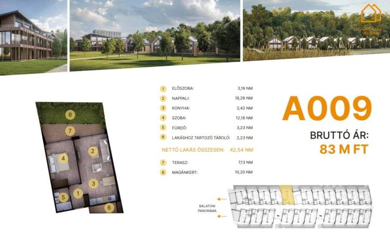 Balatonföldvár: Balatonföldvár fontos turisztikai célpont, nemcsak a magyarok, hanem más európai országok turistái számára is, természeti szépségei (például a löszhegy és a nagy virágos parkok), továbbá történelmi örökségei (például a kelta ösvény, a régi kúriák és villák) miatt számtalan szabadidős lehetőséget, valamint számos vízi sportot (vitorlázás, szörfözés, horgászat, evezés)Balaton liget willapark:Lakások száma: 56 db.Alapterület: 28-56 m².A földszinti lakásokhoz saját, privát kert tartozik.A földszinten 21 lakás található, 48–110 m² közötti alapterülettel.Az első emeleten további 21 lakás érhető el, 47–75 m² közötti méretben.A második emeleten 17 lakás kapott helyet.A lakásokhoz önálló tárolóhelyiségek tartoznak, amelyek a közös folyosóról közelíthetők meg.Környezettudatos építő anyagokA+ energetikai besorolásFelszíni parkoló: 6.350.000. Ft.Modern letisztult építészet, tömegformálás, Balatonra tájolt panorámás teraszok.Apartmanlakás - alapfelszereltség:100% tömör CLT Ausztriából.20 cm kőzetgyapot hőszigetelés.Fa hőszigetelő nyílászárók 3 rétegű üvegezéssel,tölgyfurnér melegburkolat.Porcelán greslap hidegburkolat, villeroy fürdőszoba szaniterekpadlófűtés.Levegős hőszivattyú (VRV splitklíma), 50kW társasházi napelemrendszer, elektromos redőny, szúnyogháló beépített bútoroksaját terasz.A 009. lakás.A további kérdésekkel és a megtekintéssel kapcsolatban kérem keressen a megadott mobil számon.
