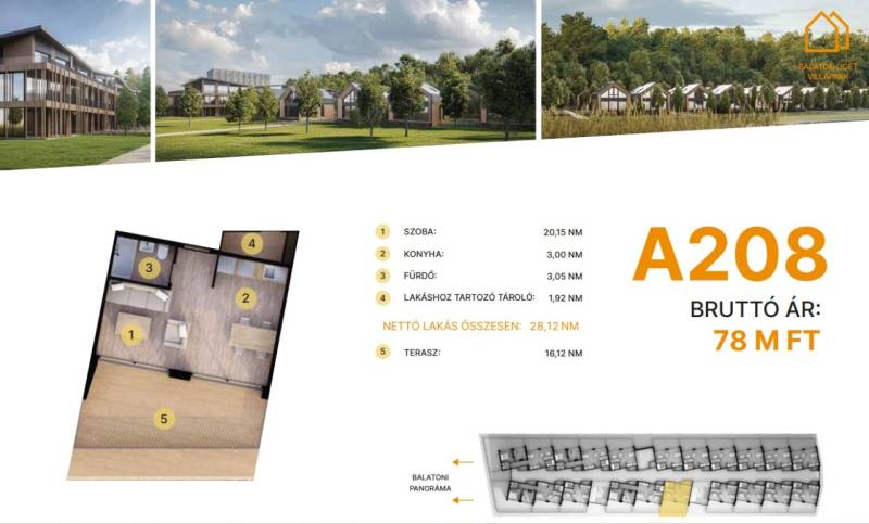Balatonföldvár: Balatonföldvár fontos turisztikai célpont, nemcsak a magyarok, hanem más európai országok turistái számára is, természeti szépségei (például a löszhegy és a nagy virágos parkok), továbbá történelmi örökségei (például a kelta ösvény, a régi kúriák és villák) miatt számtalan szabadidős lehetőséget, valamint számos vízi sportot (vitorlázás, szörfözés, horgászat, evezés)Balaton liget willapark:Lakások száma: 56 db.Alapterület: 28-56 m².A földszinti lakásokhoz saját, privát kert tartozik.A földszinten 21 lakás található, 48–110 m² közötti alapterülettel.Az első emeleten további 21 lakás érhető el, 47–75 m² közötti méretben.A második emeleten 17 lakás kapott helyet.A lakásokhoz önálló tárolóhelyiségek tartoznak, amelyek a közös folyosóról közelíthetők meg.Környezettudatos építő anyagokA+ energetikai besorolásFelszíni parkoló: 6.350.000. Ft.Modern letisztult építészet, tömegformálás, Balatonra tájolt panorámás teraszok.Apartmanlakás - alapfelszereltség:100% tömör CLT Ausztriából.20 cm kőzetgyapot hőszigetelés.Fa hőszigetelő nyílászárók 3 rétegű üvegezéssel,tölgyfurnér melegburkolat.Porcelán greslap hidegburkolat, villeroy fürdőszoba szaniterekpadlófűtés.Levegős hőszivattyú (VRV splitklíma), 50kW társasházi napelemrendszer, elektromos redőny, szúnyogháló beépített bútoroksaját terasz.A 208. lakás.A további kérdésekkel és a megtekintéssel kapcsolatban kérem keressen a megadott mobil számon.
