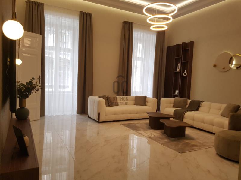 Budapest V. kerületében, a Bank negyedben kínálunk megvételre egy prémium minőségben kivitelezett 152 négyzetméter alapterületű, 187 nm hasznos területű ingatlant.A lakásról:A lakás központi tere az impozáns, közel 40 nm-es nappali, mely a tágas (32nm) konyha-étkezőhöz csatlakozik. A fő hálószoba hozzá kapcsolódó fürdőszobával utcai nézetű, míg a két kisebb hálószobája ( 16 és 10 nm) a belső kertes udvarra néz. A közel 5 méteres belmagasságot kihasználva az udvari \"szárny\" felett épített galéria került kialakításra remek teret adva 3. hálószobának vagy dolgozószobának illetve itt lett berendezve egy mindent elrejtő gardróbszoba. A mindennapi kényelmet további két fürdőszoba biztosítja. A fűtés és a melegvíz ellátás kondenzációs gázkazánnal történik, a hűtésről klímaberendezések gondoskodnak.A lakás minden részteltre kiterjedő felújításon esett át, Ön lehet az első lakója. A képeken látható teljes berendezés a vételár részét képezi.A társasház:Az 1875-ben épült bérház földszint plusz 3 emelettel rendelkezik, lifttel felszerelt. A homlokzata és lépcsőháza átlagos állapotú, tágas belső kertjében több nagy fa és cserje biztosítja a zöld környezetet és a madárcsicsergést a belváros közepén.Környezet:A Bank negyed a város egyik legkeresettebb része, amely számos előnnyel büszkélkedhet. A pezsgő belvárosi részen minden fontos szolgáltatás, üzlet és vendéglátóhely könnyen elérhető. A tömegközlekedés kiváló, a közeli metró- és buszmegállók révén gyorsan eljuthat a város bármely pontjára. Az ingatlan közelében található parkok és zöld területek (Szabadság tér, Erzsébet tér) lehetőséget biztosítanak a pihenésre és a szabadidős tevékenységekre, Parkolni az utcán vagy a közeli mélygarázsok egyikében lehetséges.Az ingatlan sokféle funkcióra alkalmas, így akár családi otthonként, akár befektetési célú ingatlanként, akár irodaként is kiváló választás.Bármilyen kérdése van az ingatlannal vagy megtekintéssel kapcsolatban keressen bizalommal!