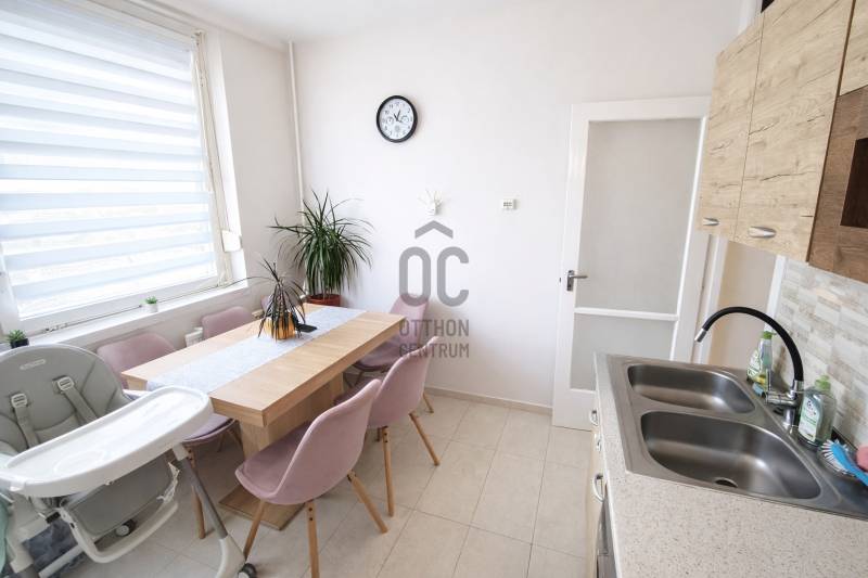 Tágas, jól variálható elrendezés, erkély, megújult vizes helyiségek és kiszámítható fenntartási költségek – mindez Tócóskert egyik jól megközelíthető, infrastruktúrával kiválóan ellátott részén.A lakásrólA 68 m²-es, háromszobás ingatlan a társasház nyolcadik emeletén helyezkedik el. A jelenlegi alaprajz körbejárható, a helyiségek egymásból nyílnak, ami tágas térérzetet biztosít. Igény esetén egy könnyűszerkezetes válaszfal elhelyezésével a lakás három külön nyíló szobássá alakítható, és ezzel egyidejűleg gardrób vagy külön tárolóhelyiség is leválasztható. Az előszoba kifejezetten tágas, nagy méretű beépített szekrényekkel, amelyek praktikus tárolási lehetőséget biztosítanak a mindennapokban. A nappali erkélykapcsolatos, amely használható kiegészítő életteret jelent. A konyha-étkező tágas, világos, kialakítása lehetővé teszi, hogy akár többtagú család is kényelmesen le tudjon ülni az asztal köré. A fürdőszoba és a WC külön helyiségben található, mindkettő 2023-ban megújult. Ugyanebben az évben az elektromos hálózat korszerűsítése is megtörtént. A nappaliban klíma került felszerelésre. Az egyik szobában műanyag nyílászáró található, a többi helyiség fa ablakokkal rendelkezik. A fűtés és a meleg víz jelenleg mérés nélküli távhővel működik: a téli hat hónapban a havi költség 23.000 Ft, a nyári hónapokban 8.000 Ft. Az ingatlan tehermentes.A társasházrólA lakás egy tízemeletes panelépületben található, amely nagy méretű lifttel rendelkezik. Szintenként mindössze három lakás került kialakításra, ami alacsonyabb átmenő forgalmat és csendesebb lakókörnyezetet eredményez. A társasház gazdálkodása rendezett, folyamatos karbantartás jellemzi. Legkésőbb jövőre mért távfűtési rendszer kerül bevezetésre. A korszerűsítés finanszírozása a ház megtakarítási alapjából történik, amelyet a havi 24.000 Ft-os közös költség tartalmaz, így a tulajdonosok részéről külön befizetést nem igényel. Közös pincerész és kerékpártárolási lehetőség biztosított.A környékrőlTócóskert Debrecen egyik jól kiépített lakótelepi városrésze, ahol a mindennapi élethez szükséges szolgáltatások gyalogosan elérhetők. A közelben üzletek, piac, posta, drogéria és egyéb kereskedelmi egységek találhatók. A tömegközlekedés kifejezetten kedvező: a buszmegálló 200 méterre található, ahonnan több járat is biztosít közvetlen kapcsolatot a város különböző pontjai felé. A közelben óvodák és iskolák is működnek. A városrész jelentős zöldfelületekkel rendelkezik, parkokkal, sportpályákkal és sétányokkal, amelyek hozzájárulnak az élhető lakókörnyezethez. A környéken a parkolás jelenleg ingyenesen megoldható, ami a mindennapokban kényelmes és költséghatékony lehetőséget jelent.Átgondolt elrendezésű, továbbfejleszthető alaprajzú lakás stabil társasházi háttérrel és kiváló elhelyezkedéssel.Hívjon bizalommal, egyeztessünk időpontot, és nézze meg személyesen, mit tud nyújtani Önnek ez a tócóskerti otthon!