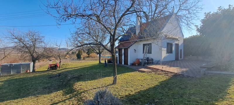 A Tóti-hegy lábánál kínálom eladásra ezt a 60-as években épült és 2015-ben a falakig (téglából) visszabontott épületet nagyméretű telekkel, mely teljes felújításon esett át. Ebbe beletartozik a víz- és villanyvezetékek, és teljes tető cseréje (cserépfedésű és látszógerendás), festés, vadonatúj konyha, padlózat, nyílászárók (fából), 5 cm-es dryvit szigetelés, vakolat. Az elosztását tekintve egy konyha-étkező-nappali, hálórész, fürdőszoba. Az épület alatt egy azonos méretű pince is található, mint a lakrész. A ház előtt és mögött is van egy-egy terasz.A 30 nm-es épület 4954 nm-es telken fekszik, ami egy helyrajzi számon van. Jelenleg 80%-ban szőlővel telepített, mely a tulajdonos által gondozott. Így azonnal lehet bővítésben is gondolkodni és akár egy 90 nm alapterületű ingatlanra átalakítani. A területen találunk még dió, alma, mandula és őszibarack fát is.A közművek közül árammal ( 3*20 Amper), vezetékes vízzel rendelkezik. Zárt emésztő van, ami körülbelül 3 köbméteres. A fűtése infra-panellel, cserépkályhával, de akár még hűtő-fűtő klímával is történhet. A pincében is helyeztek el egy hűtő-fűtő klímát.2025 októberében telepített 8 kw-os nappelem rendszer.A ház oldalában van még egy kis tároló is a kerti szerszámoknak és egy angol wc.A telek gyönyörű környezetben található, mely könnyen megközelíthető télen és nyáron egyaránt. A panoráma lenyűgöző a Tóti-hegyre, a Csobáncra, Hegyestűre, és Gulácsra.Kifüggesztés köteles!Amennyiben kérdése merül fel az ingatlannal kapcsolatban, vagy szeretné azt megtekinteni kérem keressen az alábbi elérhetőségek egyikén!Az adatok kizárólag a megbízóink által rendelkezésünkre bocsátott információkon alapulnak. Fentiekre tekintettel, az adatok teljességéért, helyességéért és aktualitásáért nem vállalunk felelősséget.Az árváltozás, adatmódosítás és közbeni értékesítés jogát fenntartjuk, mindezekért jogi felelősséget nem áll módunkban vállalni.