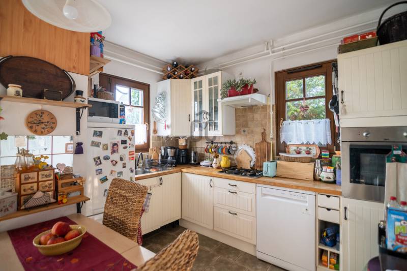 Eladásra kínáljuk gondosan karbantartott, kétszintes, sorház jellegű családi házat Budakeszi egyik legszebb és legkeresettebb részén, Virágvölgy csendes utcájában, a 12. kerület határán, közvetlenül az erdő szomszédságában.Az ingatlan a város északkeleti határán, a hajdani villa-üdülő övezetben, kiemelt presztízsű környezetben, a János-hegy közvetlen közelében helyezkedik el – ideális választás azok számára, akik a természet közelségét és a városi elérhetőséget egyaránt fontosnak tartják.Főbb paraméterekLakóterület: 95 m²Elrendezés: nappali + 3 külön nyíló szobaÉpület: 2 szintes, sorház jellegű (nincs közös fala a szomszéd ingatlannal)Földszint:előszobavilágos nappali valódi fatüzelésű kandallóvalkonyha - étkezőkádas fürdőszoba - wcteraszTetőtér:2 hálószoba (egyik hűtő-fűtő klímával)félszoba+ padlás tárolásraMűszaki és állapotAz ingatlan néhány éve belső felújításon esett átEgyedi fa nyílászárók, 3 kamrás üvegezésselBiztonsági zárral ellátott bejárati ajtóTetőtéri ablakok működőképesek, esztétikai felújítást igényelnekTisztasági festés után beköltözhetőKert és telekIntim, körbe kerített saját kert, ideális pihenésreOsztatlan közös tulajdonú telek, ügyvédi megosztássalKözművek – fontos információA vízvezeték-rendszer 2025 nyarán részben szétválasztásra kerültA külön csövek már lefektetésre kerültek, bekötésük és az önálló vízórák telepítése szükséges a teljes leváláshozJelenleg egy új közös gerincen történik az ellátásElhelyezkedés és közlekedésRendezett, aszfaltozott utcában, a városközponthoz közel.Parkolás a telken belül. Tömegközlekedés: Budapest–Budakeszi határán, kiváló elérhetőség:22, 22A, 222, 188, 188E és távolsági buszok 6-7 perc sétaSzéll Kálmán tér kb. 20 perc alatt elérhetőBevásárlás, gyógyszertár, orvos, éttermek ~5 perc sétára