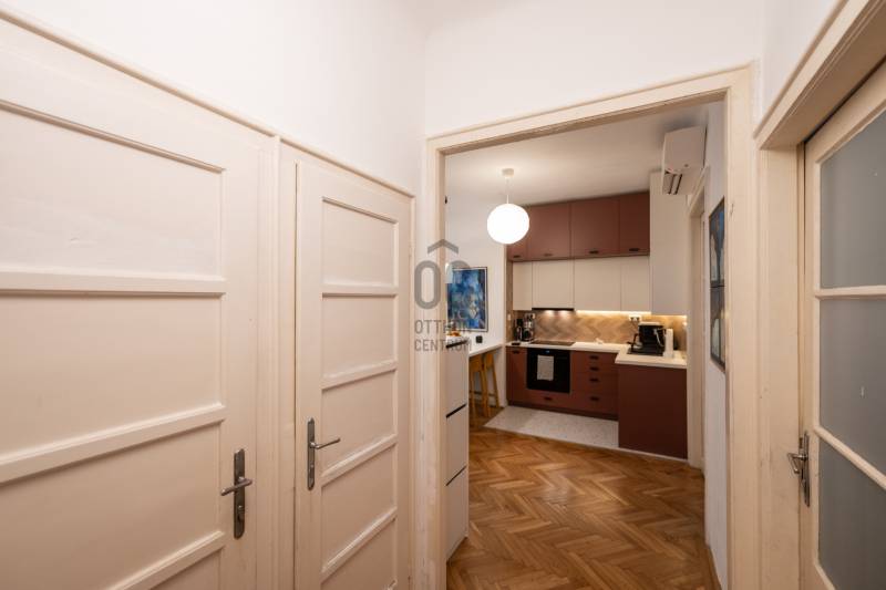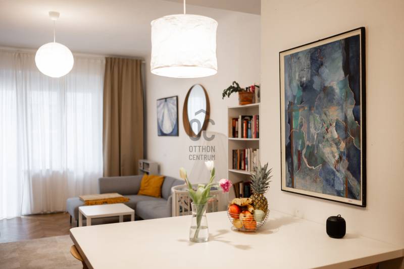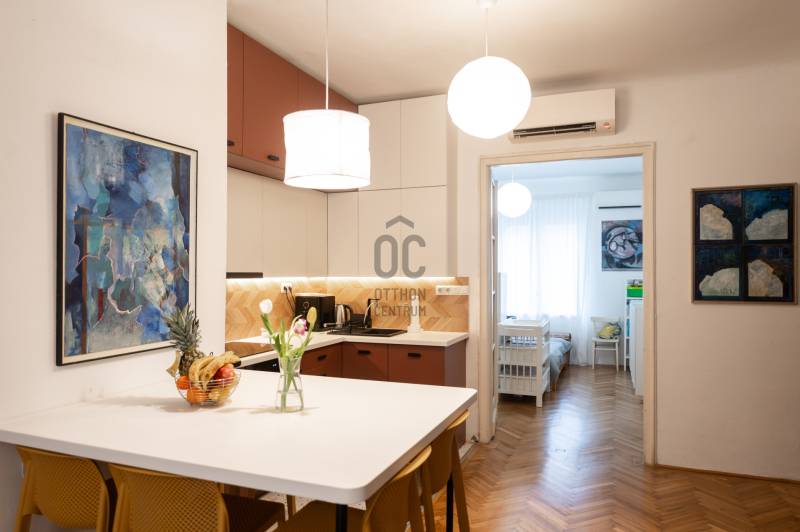 Kiváló adottságú, kéterkélyes lakás eladó a VI. kerület közkedvelt részén, pár perc sétára az Andrássy út-tól.Az ingatlan kelet–nyugati tájolásának köszönhetően egész nap világos, remekül átszellőztethető, alaprajza praktikus és jól élhető. A tulajdonosok saját részre, igényesen újították fel, minőségi és tartós megoldásokkal.A külső nyílászárók cseréje megtörtént (prémium bejárati ajtó, korszerű, passzívház-minőségű ablakok). A fűtésrendszer modern, energiatakarékos Daikin hőszivattyúra lett cserélve, amely hűtésre-fűtésre egyaránt alkalmas. Az elektromos hálózat rézvezetékes, részben megújított.A konyha egyedi kialakítású: részben IKEA elemekből, részben asztalos által készített bútorokkal, minőségi frontokkal, modern gépesítéssel (wifi-képes sütő, kerámia mosogató).A felújítás közel teljes körű, a fürdőszoba esztétikai frissítése, a kisszoba burkolása, valamint egy tisztasági festés az új tulajdonos igénye szerint alakítható.Az épület mindössze 8 lakásos, saját kerttel rendelkezik, amely ritkaság a környéken. A ház teljes felújítása előkészített, a szükséges engedélyek és árajánlatok rendelkezésre állnak. A tervek szerint homlokzati szigetelés és további korszerűsítések valósulnak meg, amely az ingatlan értékét tovább növeli.Az elhelyezkedés kiváló: az Oktogon 8 perc, a Városliget kb. 13 perc sétára található. A környék infrastruktúrája és közlekedése kiemelkedő, így saját otthonnak és befektetésnek egyaránt ideális választás.További információért és megtekintésért keressen bizalommal!