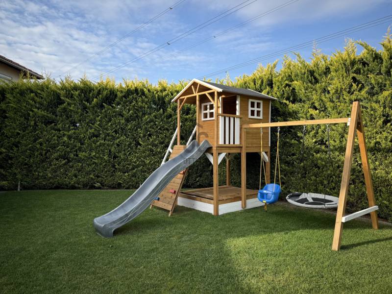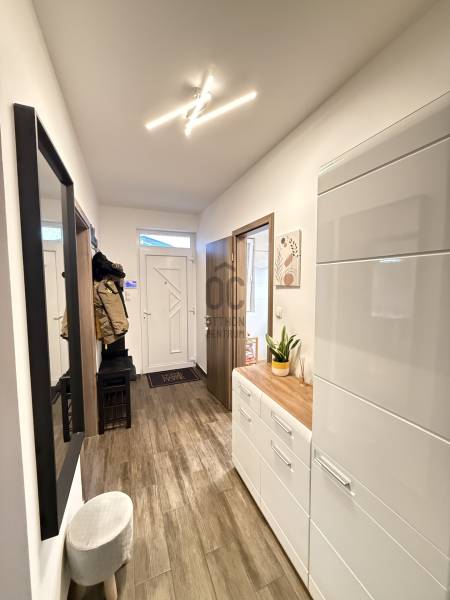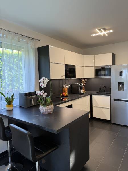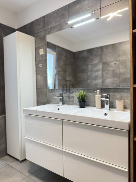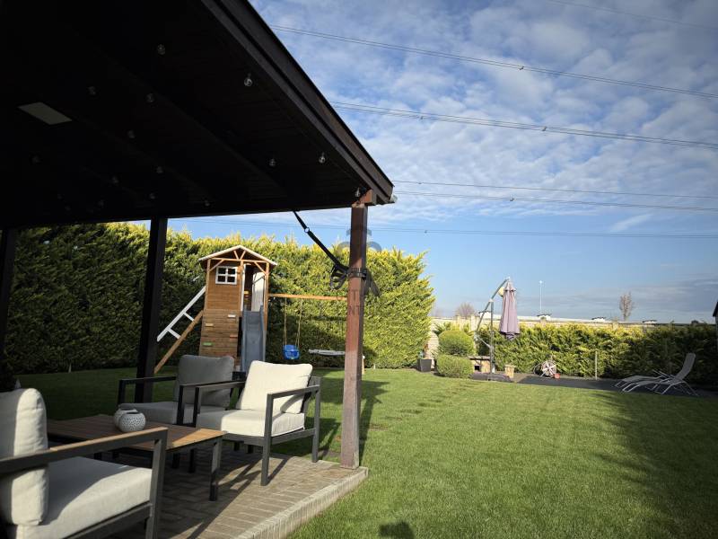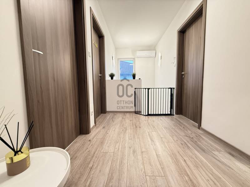 Modern, otthonos családi ikerház eladó Dunakeszin, a Malomárok Lakóparkban.Dunakeszi egyik legkedveltebb, nyugodt részén, a Malomárok Lakóparkban kínálunk megvételre egy 2018-ban épült, kiváló állapotú családi házat. Az ingatlan első tulajdonosoktól eladó.A ház bruttó 141 m², melyből 120 m² nettó lakótér, praktikus elrendezéssel, 5 szobával.Az ingatlan az ikerház másik felével kizárólag a garázsnál kapcsolódik.Földszint:•Vendégszoba / dolgozószoba•Tágas, világos amerikai konyhás nappali•Kamra•Fürdőszoba WC-velEmelet:•3 kényelmes hálószoba•Külön WC•Külön fürdőszobaMűszaki tartalom, extrák:•Gázkazános fűtés, padlófűtés és radiátorok kombinációjával•2 db hűtő-fűtő klímaberendezés•BWT vízlágyító rendszer•Minden nyílászárón alumínium redőny és szúnyogháló•Gondozott kert gyepszőnyeggel, növényekkel és automata öntözőrendszerrel•27 m²-es fedett terasz, ideális pihenéshez és a nyári grillpartykhoz•10 m²-es kerti faházKörnyezet, elhelyezkedés:•M2 és M0 autóút gyors elérhetőség•Belváros 20-25p alatt elérhető•Csendes, nyugodt lakókörnyezet•Közelben bevásárlási lehetőségek, iskola, óvoda a közelben•A Duna-part 5–10 perc sétára, kiváló kikapcsolódási lehetőségekkelA vételár tartalmazza a berendezés nagy részét a beépített bútorokon kívül is. (Játszótér, kerti sütögető stb.) Komoly szándék esetén ezek egyeztetésre kerülnek.Ez az ingatlan tökéletes választás azok számára, akik modern, jól felszerelt, gyorsan költözhető otthont keresnek Dunakeszin.